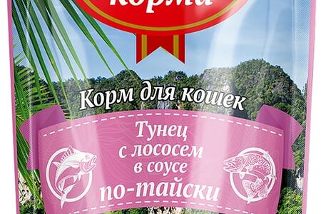 Влажный корм для кошек Родные корма Заморские Тунец с лососем в соусе по-тайски 70г доставка