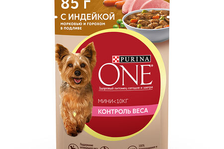 Влажный корм Purina ONE Мини Контроль веса для взрослых собак мелких пород с низкой физической активностью или склонных к набору веса, с индейкой, морковью и горохом в подливе 85 г доставка