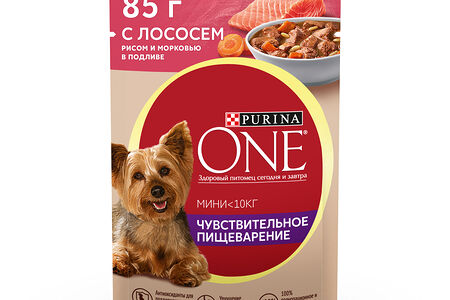 Влажный корм Purina ONE Мини Чувствительное пищеварение для взрослых собак мелких пород с чувствительным пищеварением, с лососем, рисом и морковью в подливе 85 г доставка