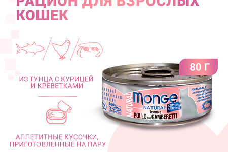 Влажный корм для кошек Monge Cat Natural Тунец с курицей и креветками 80г доставка