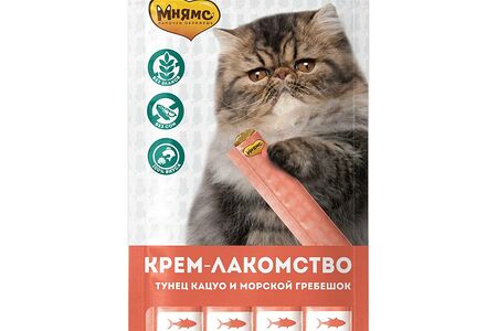 Мнямс Крем-лакомство для кошек Тунец Кацуо и Морской гребешок, 15 г. х 4 шт. доставка