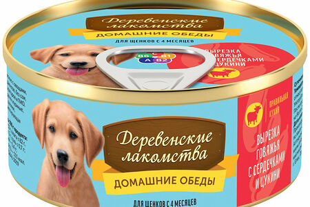 Деревенские лакомства консервы "Домашние обеды вырезка говяжья с сердечками и цукинни" для щенков Говядина и сердце доставка