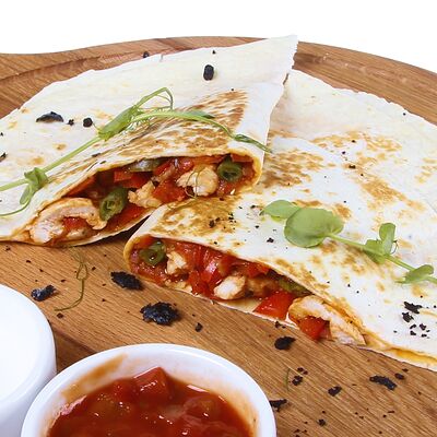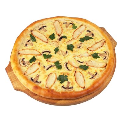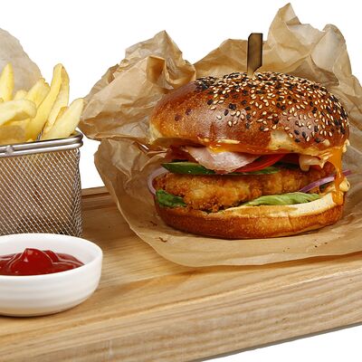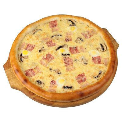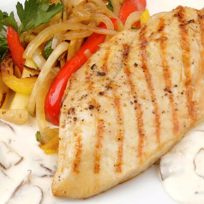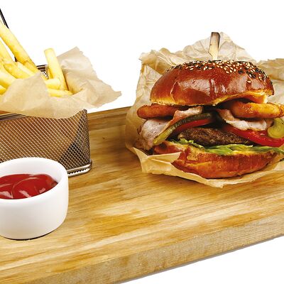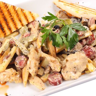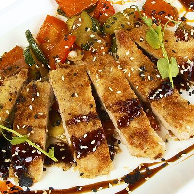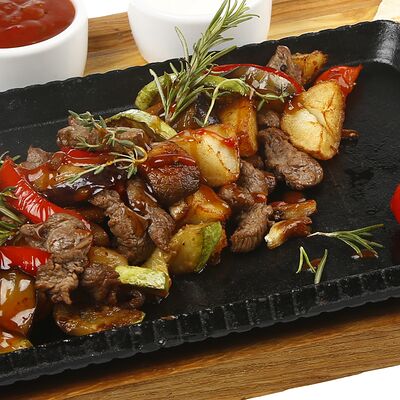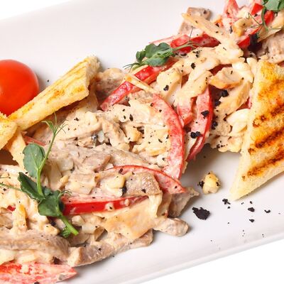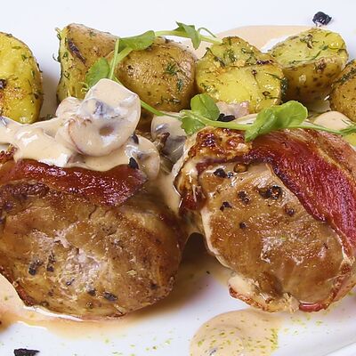 Запеченная свиная вырезка, обернутая беконом. Подается с печеным мини картофелем и грибным соусом
