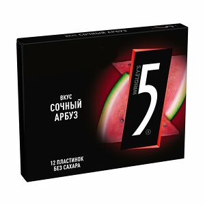 Жевательная резинка "Сочный арбуз", Five, в формате пластинок с насыщенным ягодным вкусом обладает мягкой приятной текстурой. Стильная чёрная пачка легко помещается в кармане и в сумочке, да и в ящике рабочего стола ей тоже найдётся место. Без сахара. Масса нетто: 32,2 г.