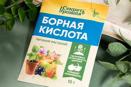 Борная кислота, Секрет урожая – микроэлемент, необходимый растениям в течение всего вегетационного периода. Бор способствует увеличению завязей во время цветения. Стимулирует образование новых точек роста. Повышает устойчивость растений к неблагоприятным условиям. Перед использованием ознакомьтесь с инструкцией и мерами предосторожности на упаковке. Массовая доля бора – не менее 17%. Масса нетто: 10 г.