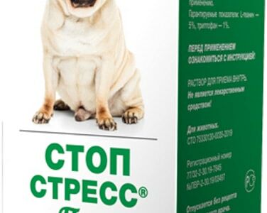 Капли для собак "Стоп Стресс Плюс" содержат в составе: L-теанин, триптофан, глицин, вспомогательные вещества. Производитель: "Апиценна", Россия. Способ применения и дозы: применяют животным перорально, индивидуально с небольшим количеством лакомства или вводят непосредственно на корень языка (или в защечный мешок) с помощью шприца-дозатора в следующих суточных дозах: собакам — 2 капли раствора на 1 кг массы животного. Суточную дозу кормовой добавки делят на два приема и задают животному утром и вечером. Перед использованием флакон с кормовой добавкой следует тщательно встряхнуть в течение 1-2 минут. Кормовая добавка может применяться длительным курсом (до 3-х месяцев) для коррекции нежелательного поведения у животных, включая необоснованную агрессию, пугливость, чрезмерную вокализацию. В целях предотвращения развития стрессовых реакций у животных (при транспортировке, приходе гостей, смене обстановки, отъезде хозяина, участии в выставках и соревнованиях, груминге) кормовую добавку "Стоп Стресс Плюс" применяют за 3-5 дней до предполагаемого мероприятия и в течение 1-4 дней после его окончания. Описание: "Стоп Стресс Плюс" для собак, 50 мл, применяют для коррекции нежелательного поведения и повышения устойчивости нервной системы у собак при стрессовых ситуациях, в том числе при транспортировке, посещении массовых мероприятий, ветеринарных учреждений, проведении груминга. Особенности и преимущества: эффективно и мягко действует на нервную систему животного; оказывает быстрый успокоительный эффект при стрессовых состояниях; помогает при транспортировке животных;