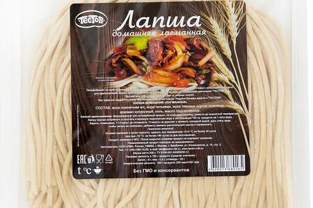 Лапша Тестов Лагманная домашняя 500г изготовлена из высших сортов муки по уникальной технологии: тесто раскручивают особым способом и вытягивают его в моток лапши. Она практически готова к употреблению - просто опустите ее в кипящую воду и варите приблизительно 5-7 минут. Лапша получится такой же вкусной, как и домашняя, приготовленная своими руками. А чтобы приготовить лагман, потушите мясо с овощами и томатным соусом, добавьте лапшу и, перемешивая, доведите ее до готовности. Торговая марка Тестов - это успешный производитель охлажденного теста c современным подходом к домашней кухне.