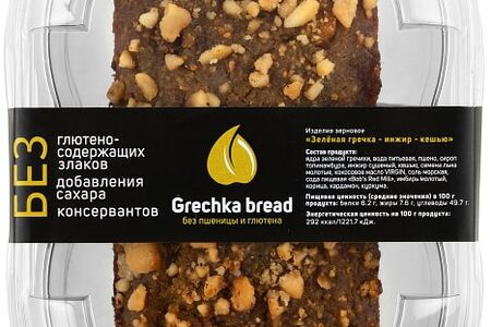 Изделие зерновое GrechkaBread из зеленой гречки с инжиром и кешью 150г – безглютеновый десертный продукт, рецепт которого был разработан под контролем нутрициолога. Производится на основе перемолотых ядер зеленой гречихи с добавлением псиллиума. В его состав также входят: молотые семена льна, сушеный инжир, кешью, сироп топинамбура, пряности и прочие ингредиенты. Десерт обладает приятным, умеренно сладким вкусом и идеально подходит к чашечке кофе или чая. Аппетитный, полезный и сытный, он отлично впишется в рацион приверженцев здорового питания, людей с непереносимостью глютена или лактозы, веганов. Продукт не содержит пшеничной муки, яиц, молока, дрожжей, закваски, сахара, консервантов и вредных добавок. В качестве упаковки используется пластиковый контейнер, надежно сохраняющий свежесть изделия в пределах всего срока годности.