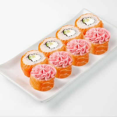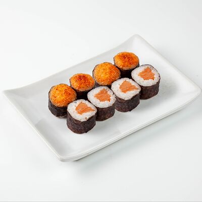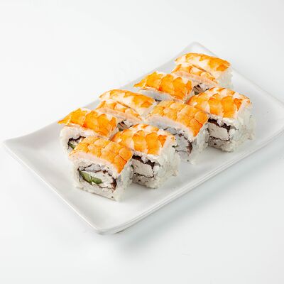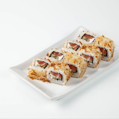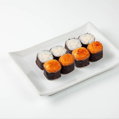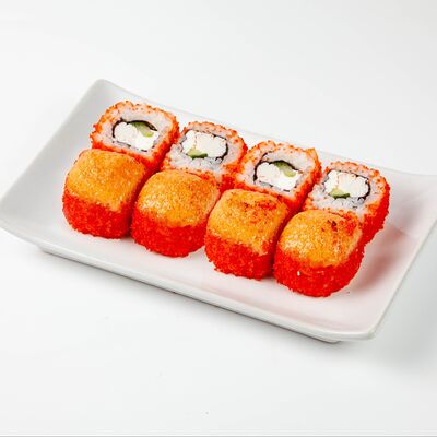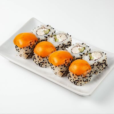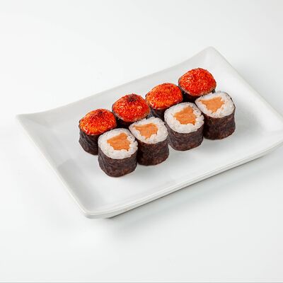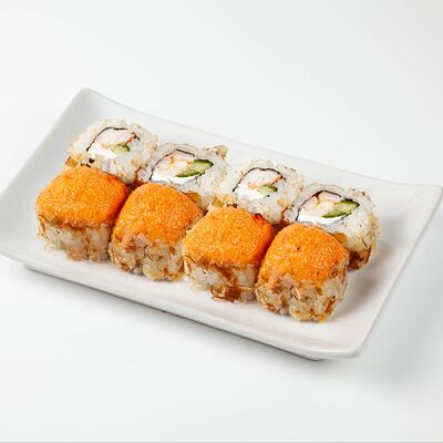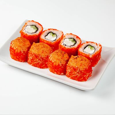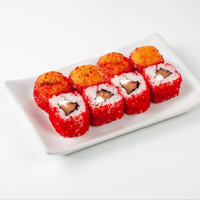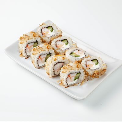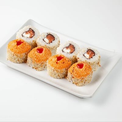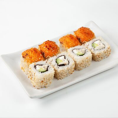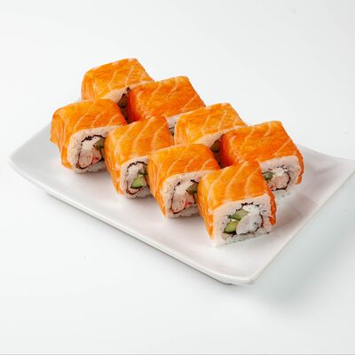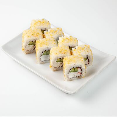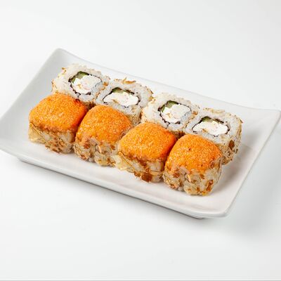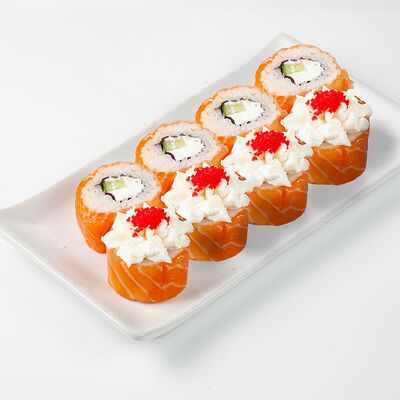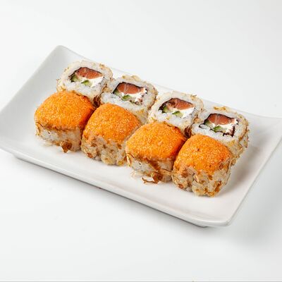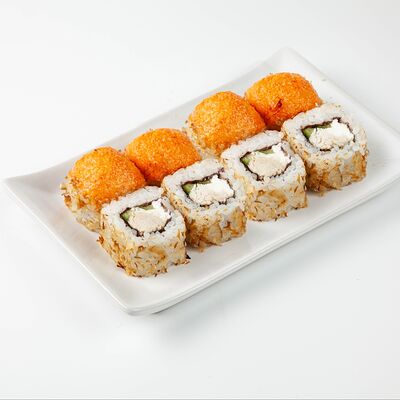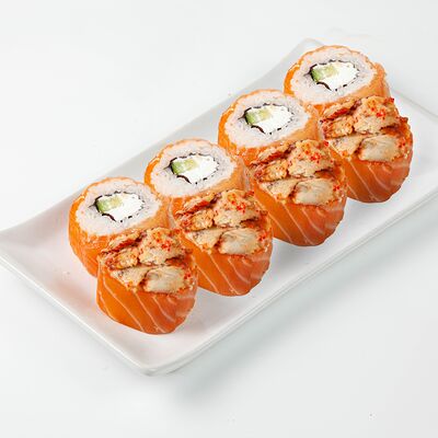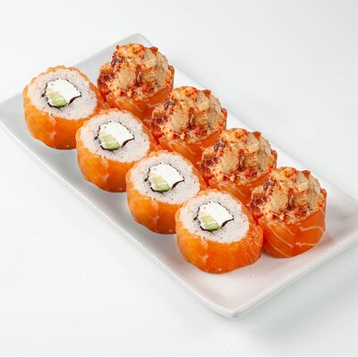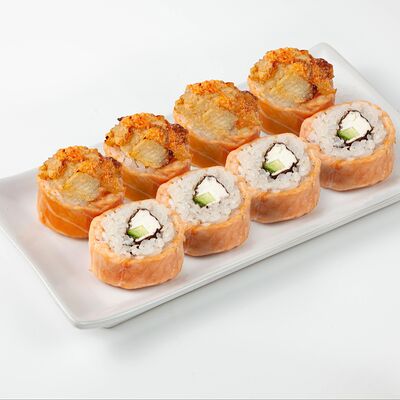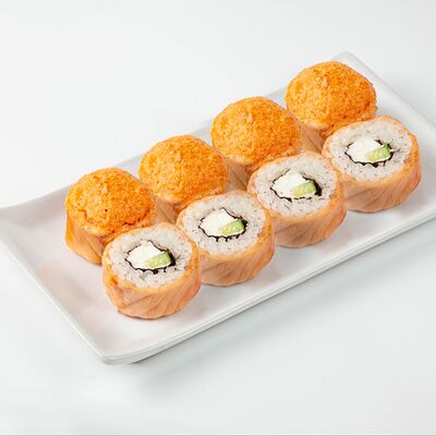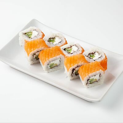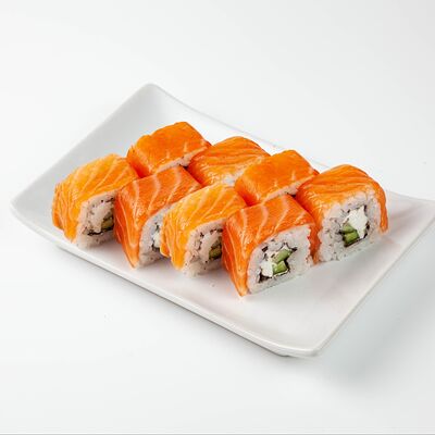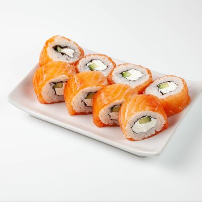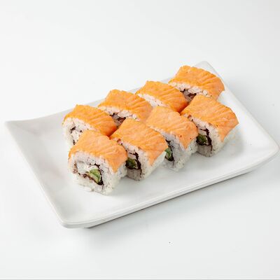 Лосось, нори, рис, огурец, сыр, соус для запекания (8 шт.). Соевый соус, васаби и имбирь не прилагаются