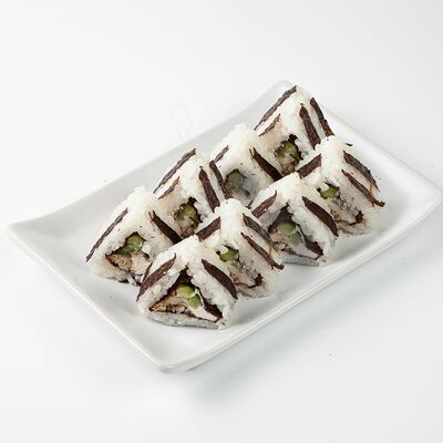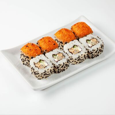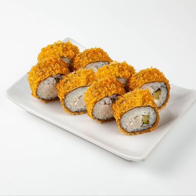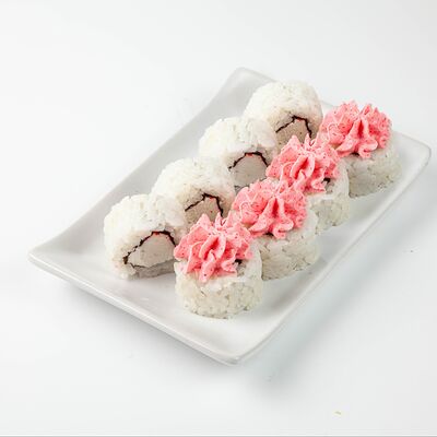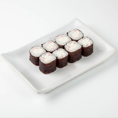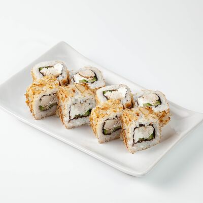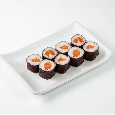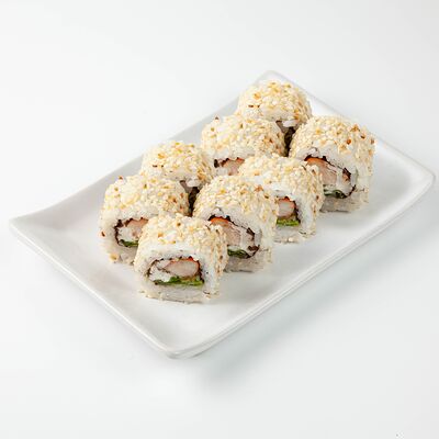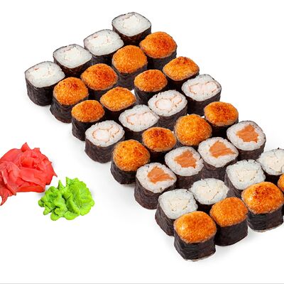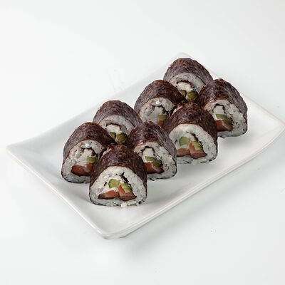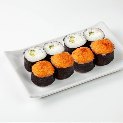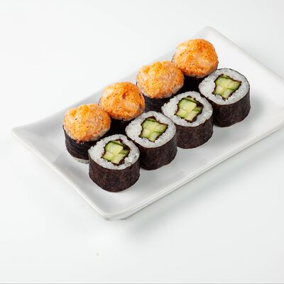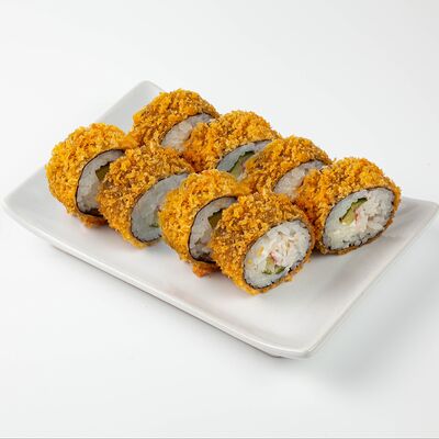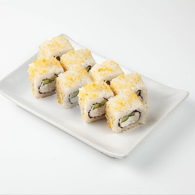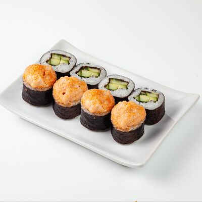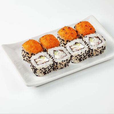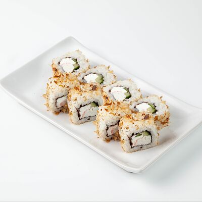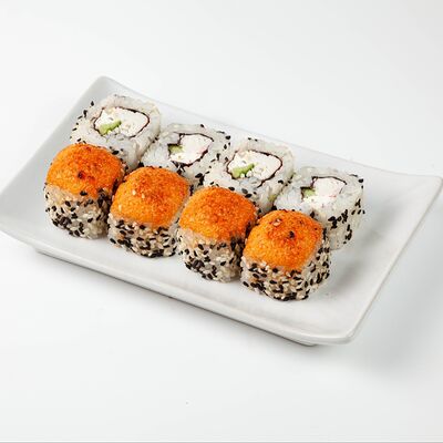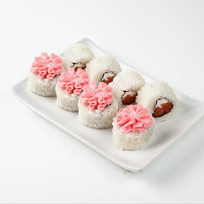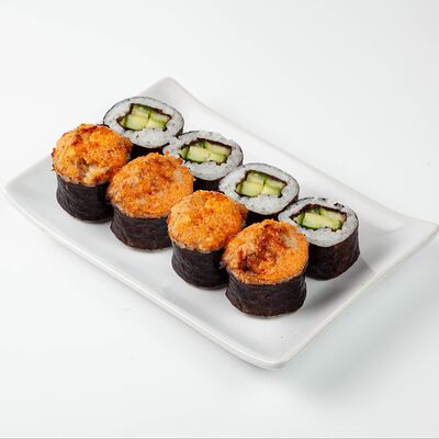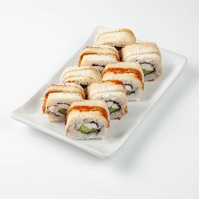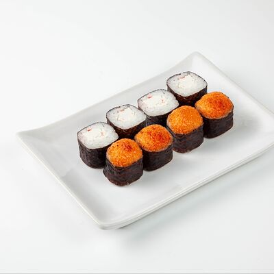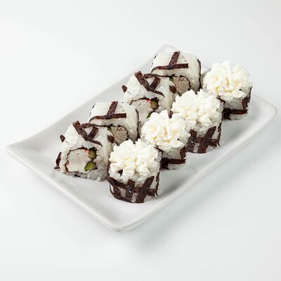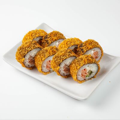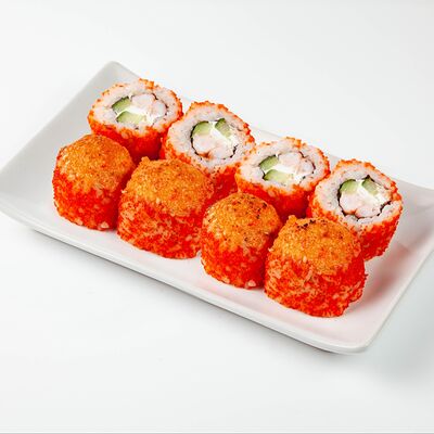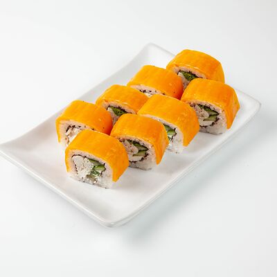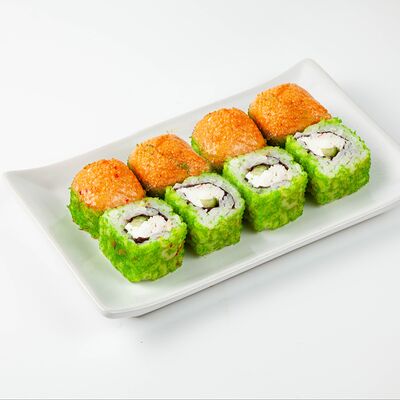 Лосось, нори, рис, огурец, сыр, соус для запекания (8 шт.). Соевый соус, васаби и имбирь не прилагаются