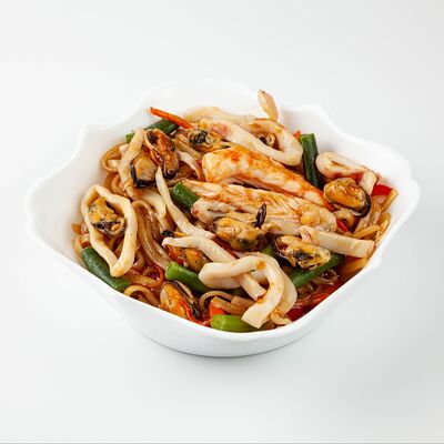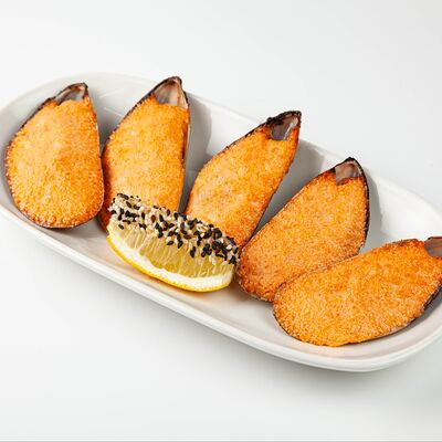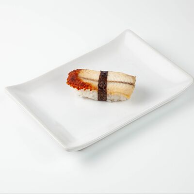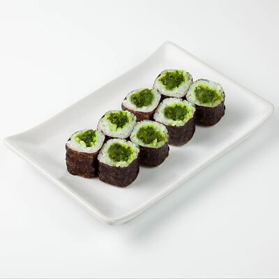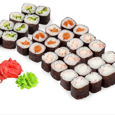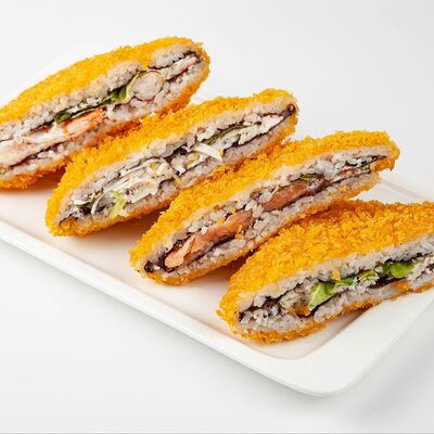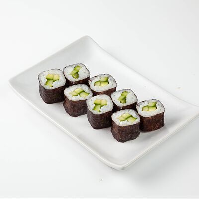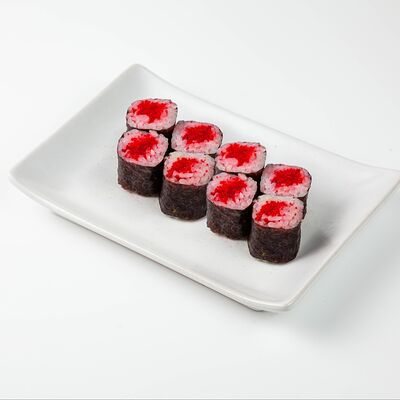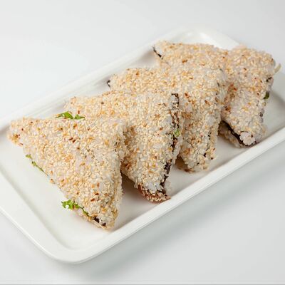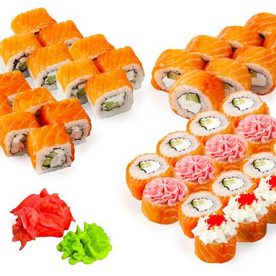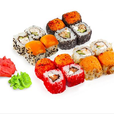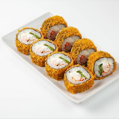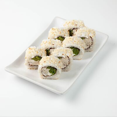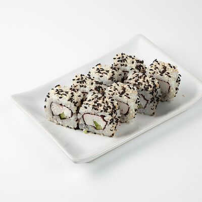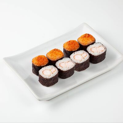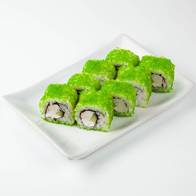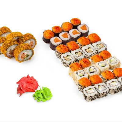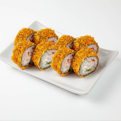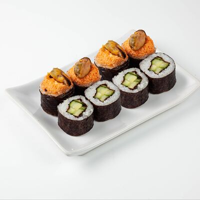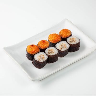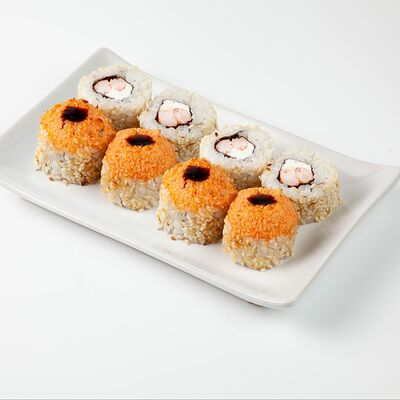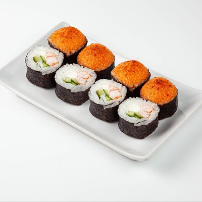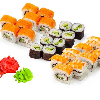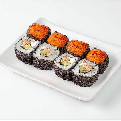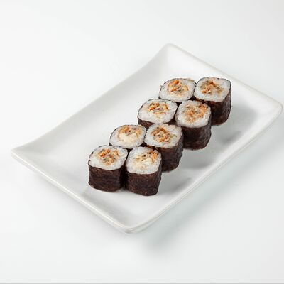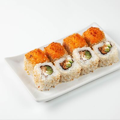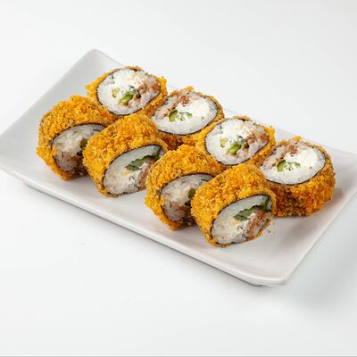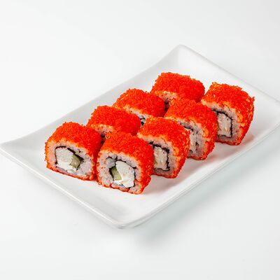 Лосось, нори, рис, огурец, сыр, соус для запекания (8 шт.). Соевый соус, васаби и имбирь не прилагаются