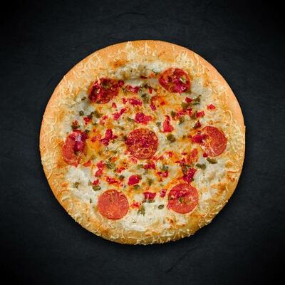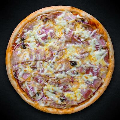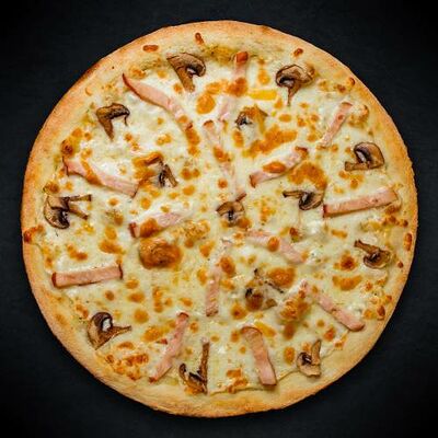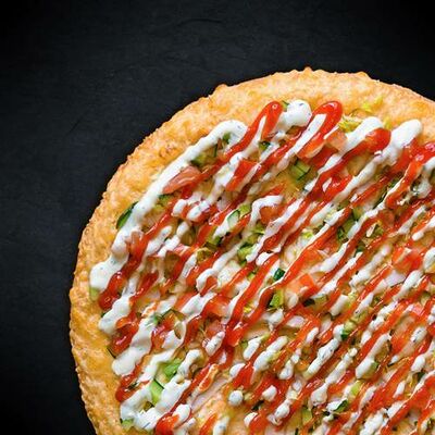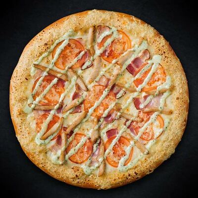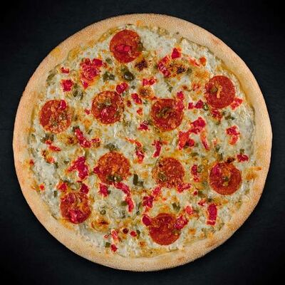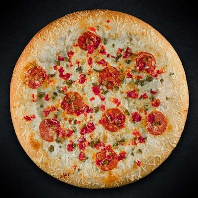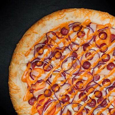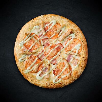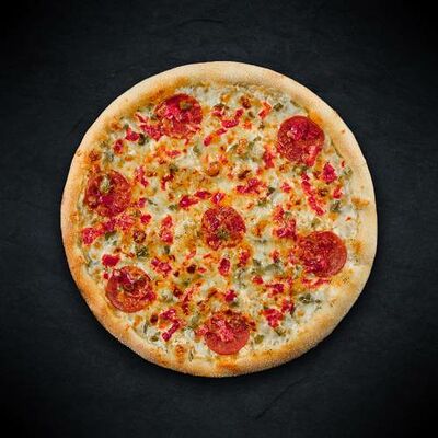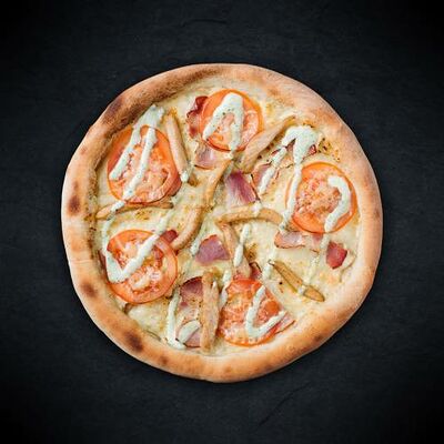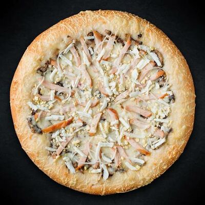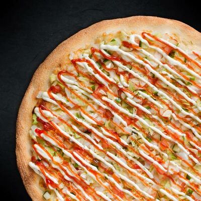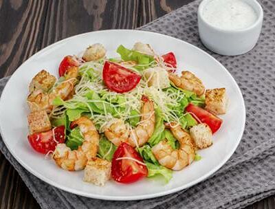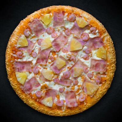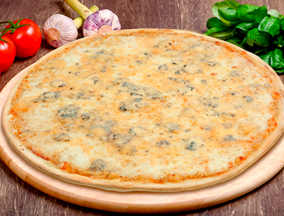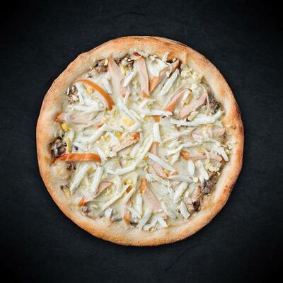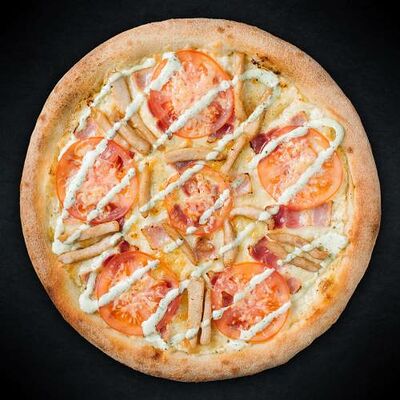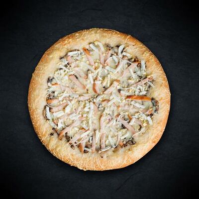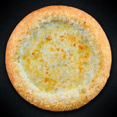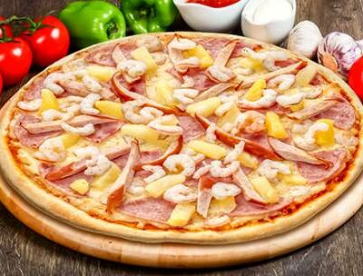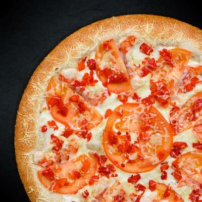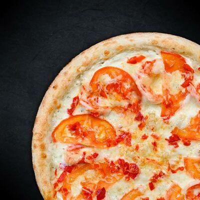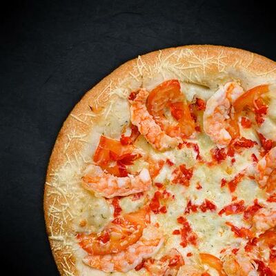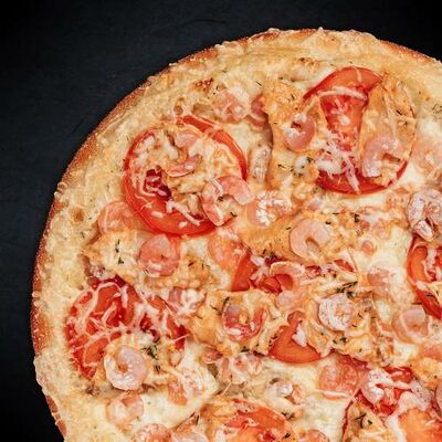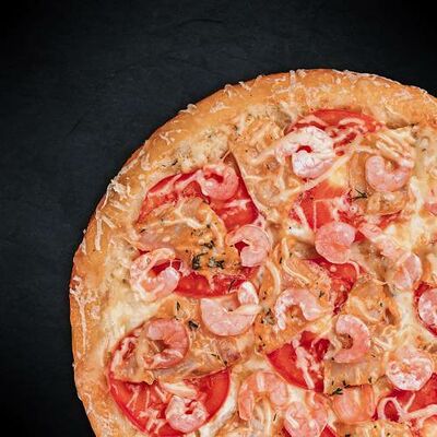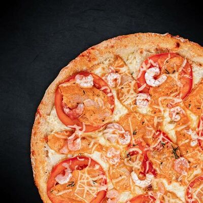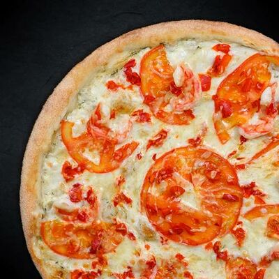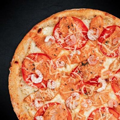 Окунь, креветка салатная, томаты, моцарелла, пармезан, сливочно-чесночный соус, сырный борт