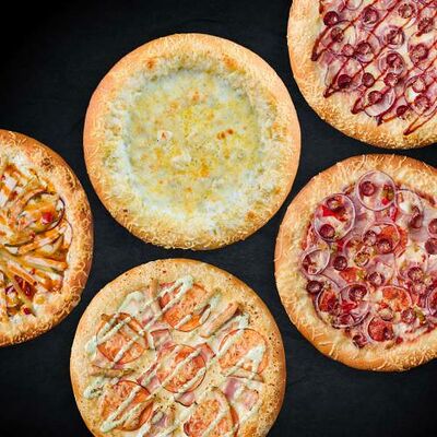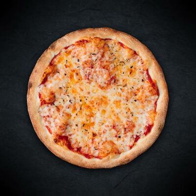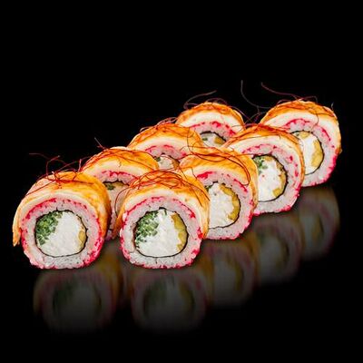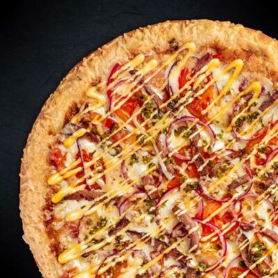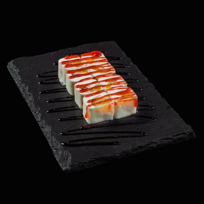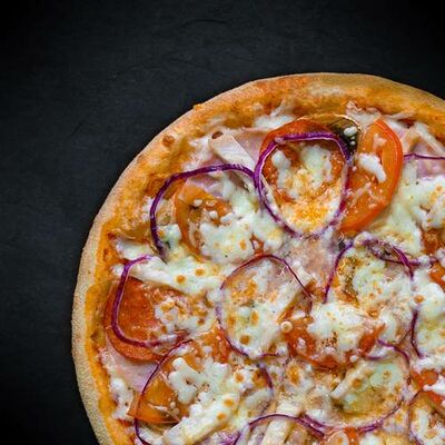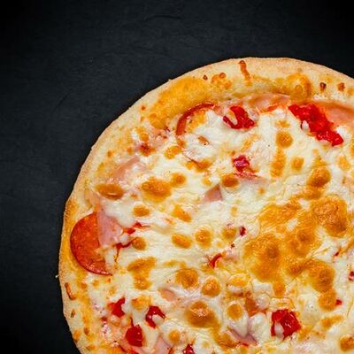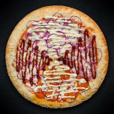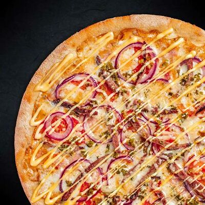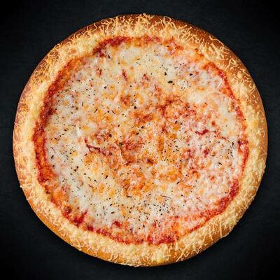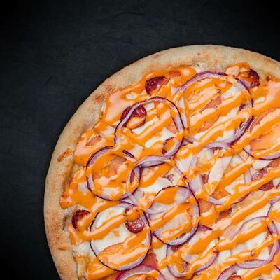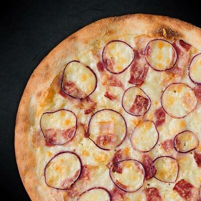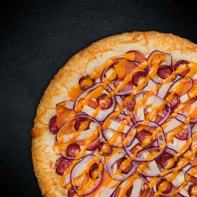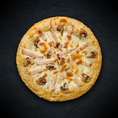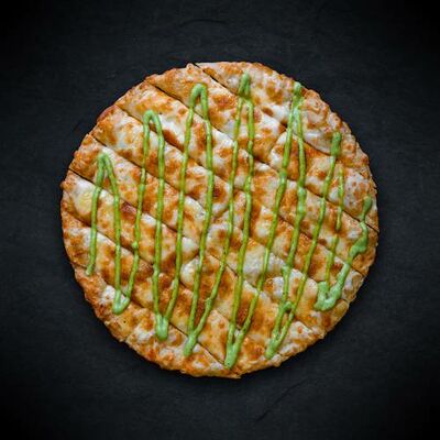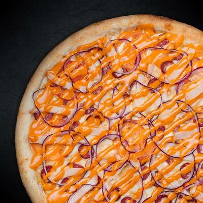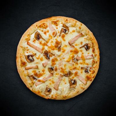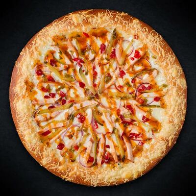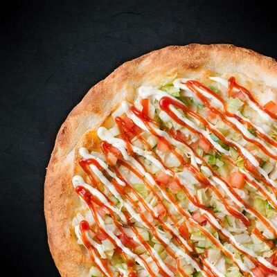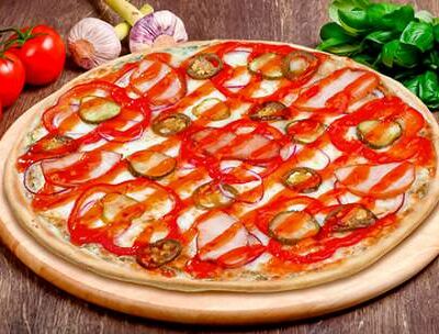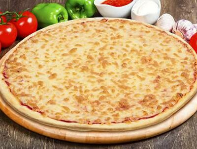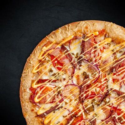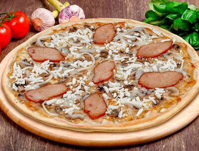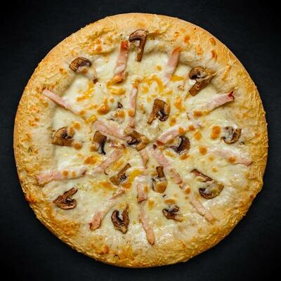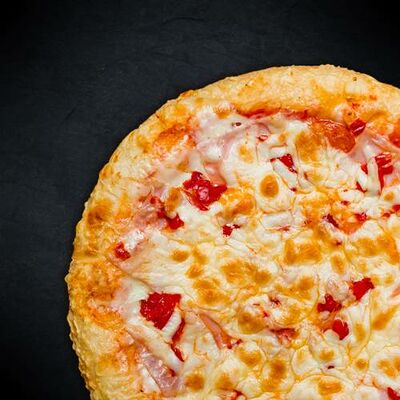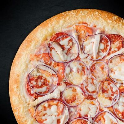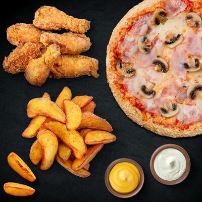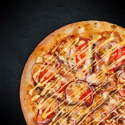 Окунь, креветка салатная, томаты, моцарелла, пармезан, сливочно-чесночный соус, сырный борт