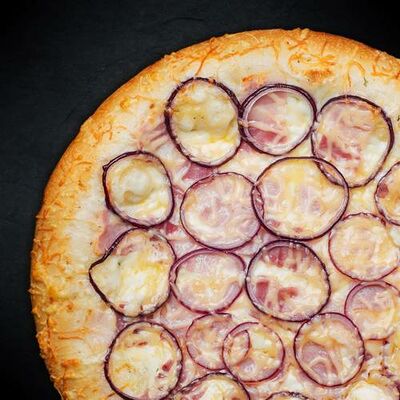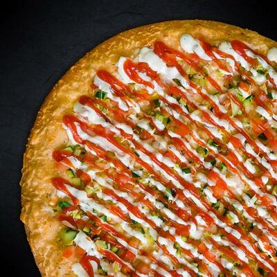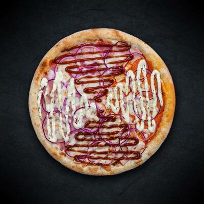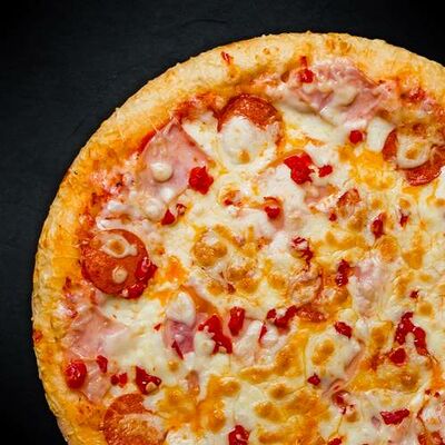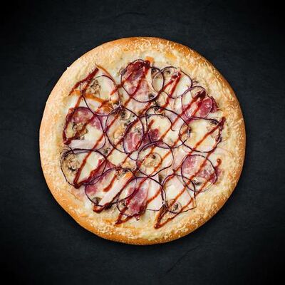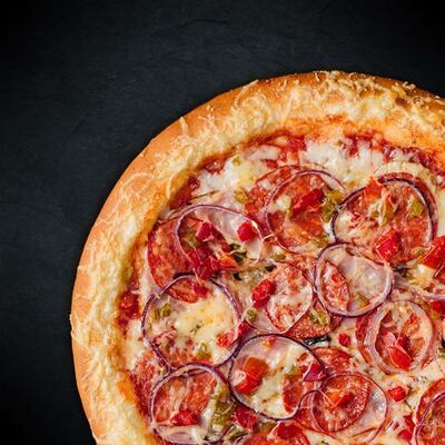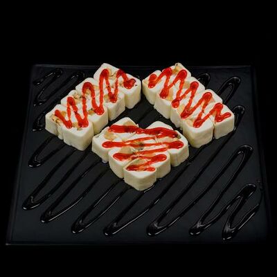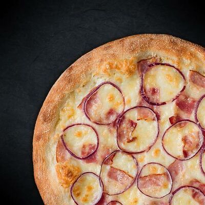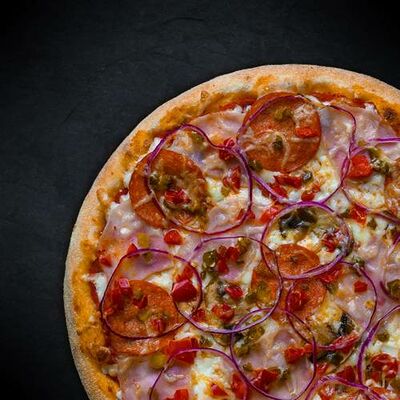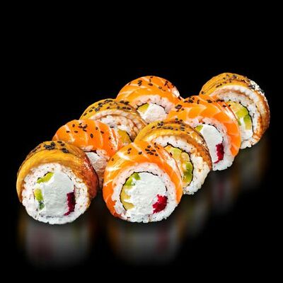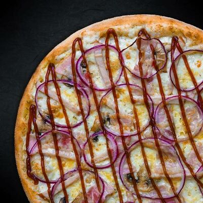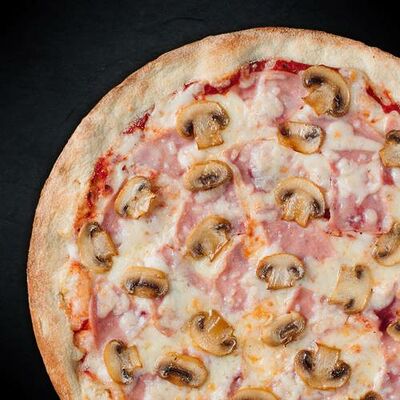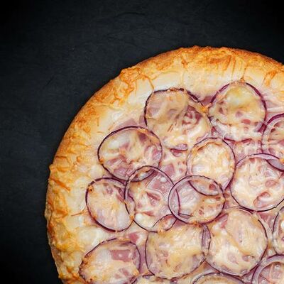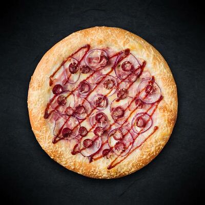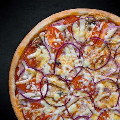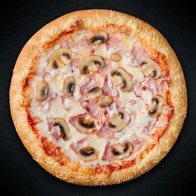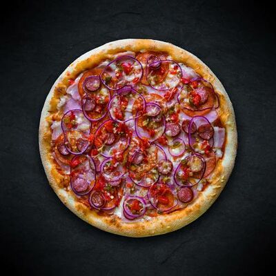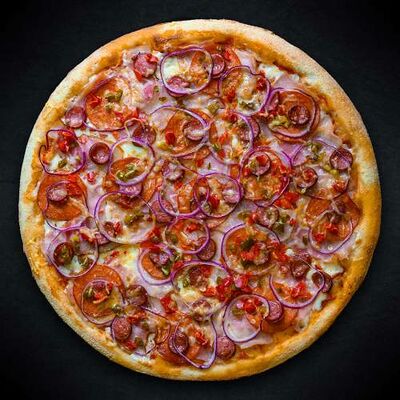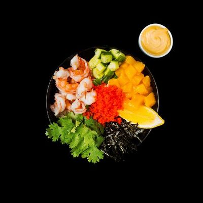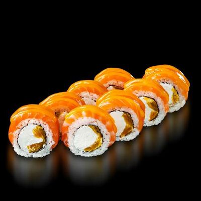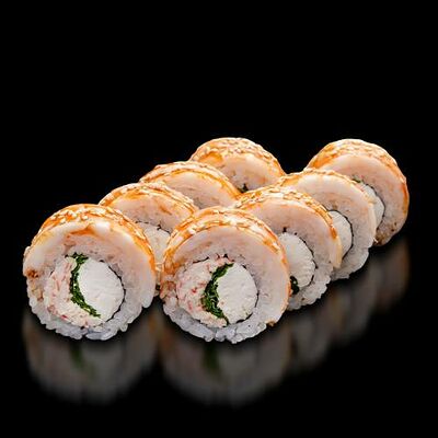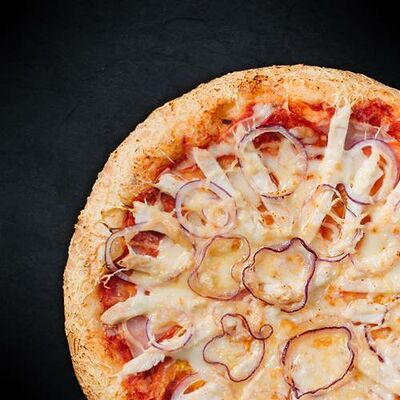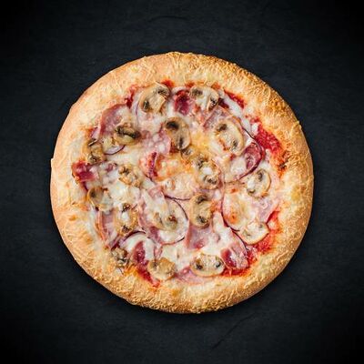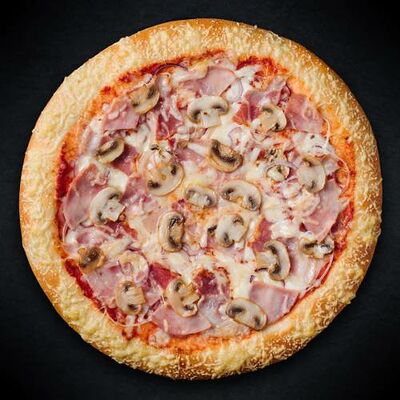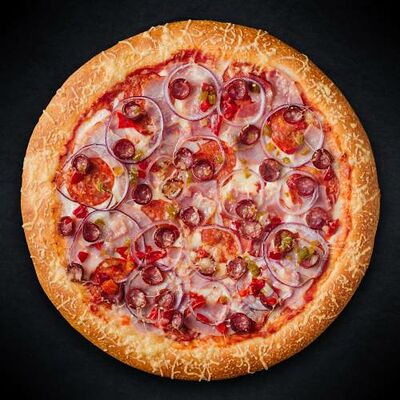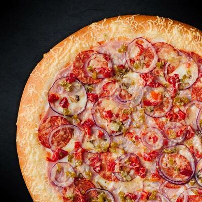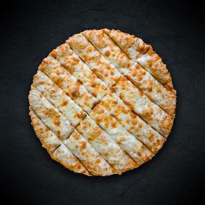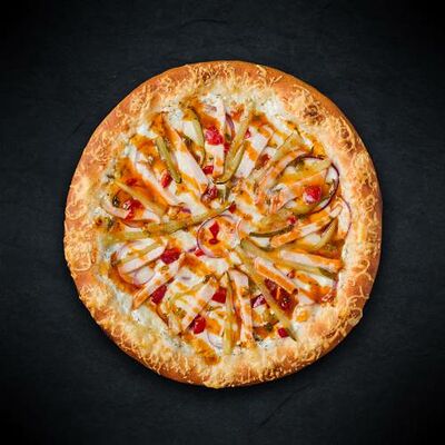 Окунь, креветка салатная, томаты, моцарелла, пармезан, сливочно-чесночный соус, сырный борт