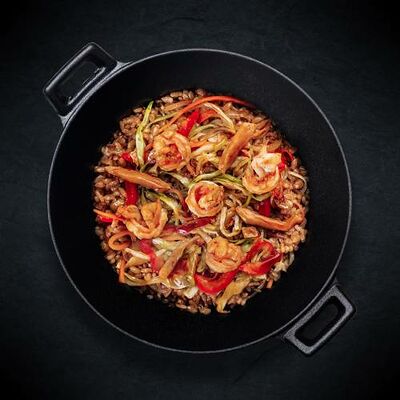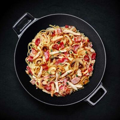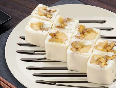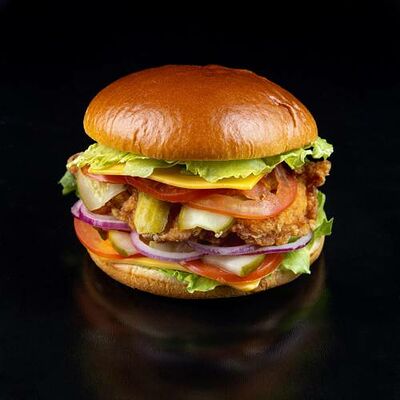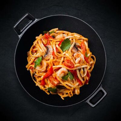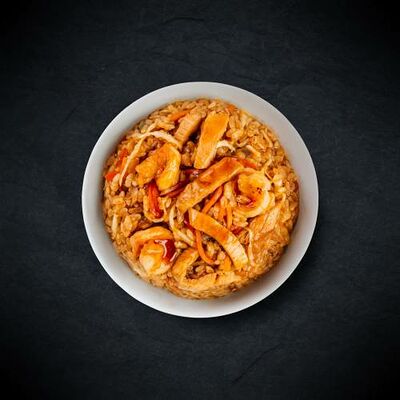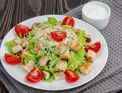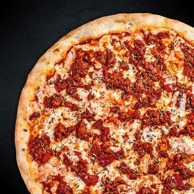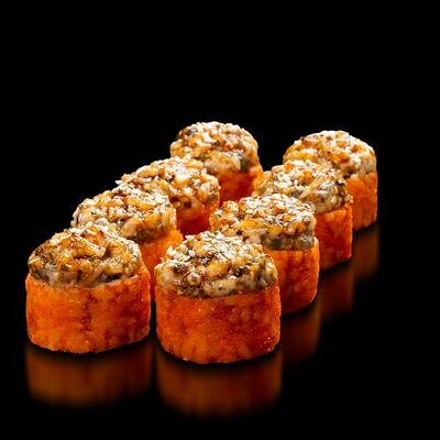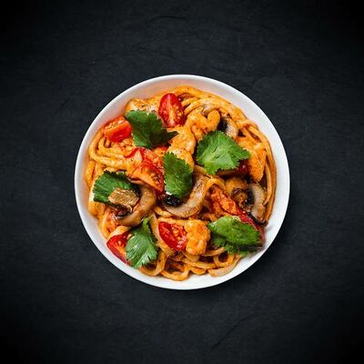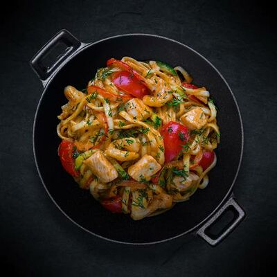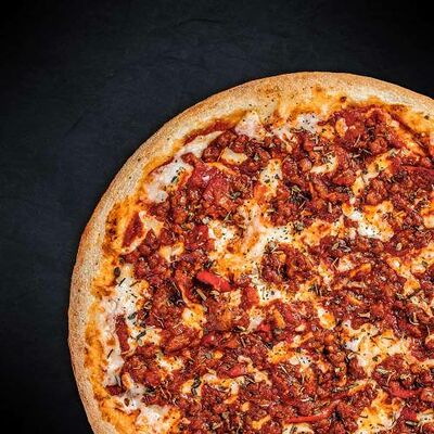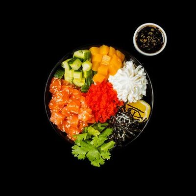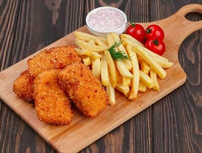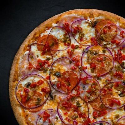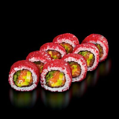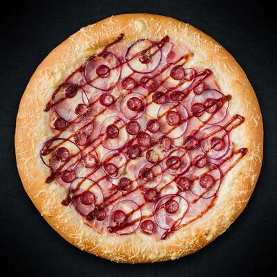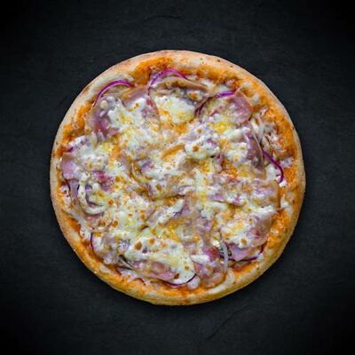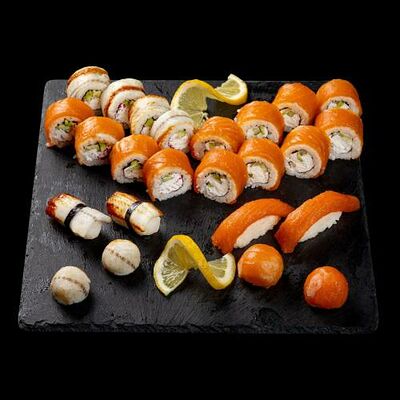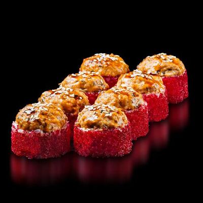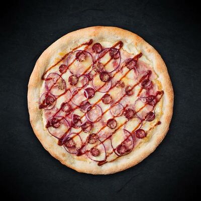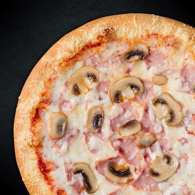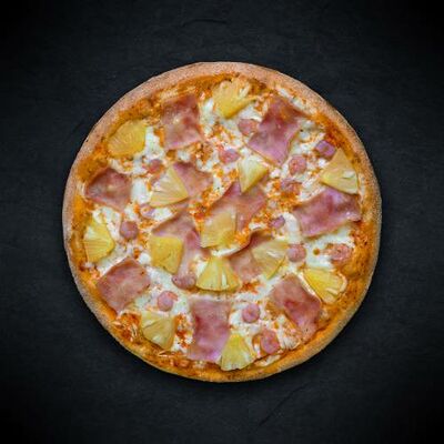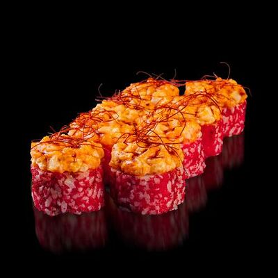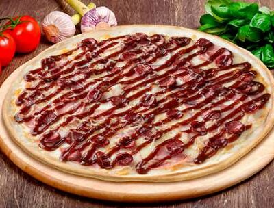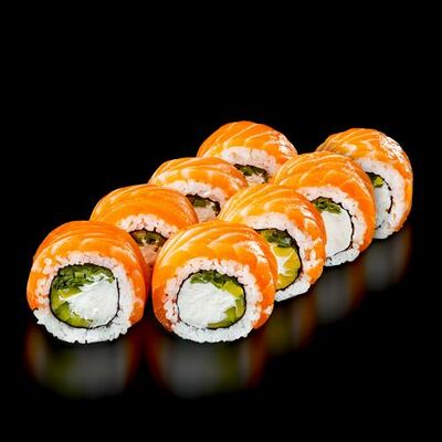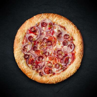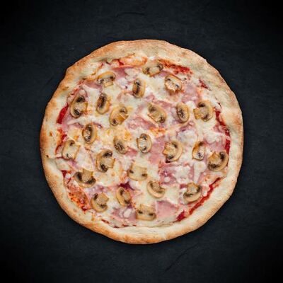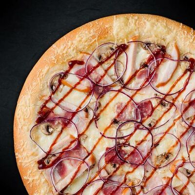 Окунь, креветка салатная, томаты, моцарелла, пармезан, сливочно-чесночный соус, сырный борт