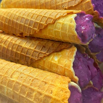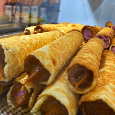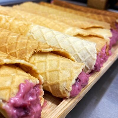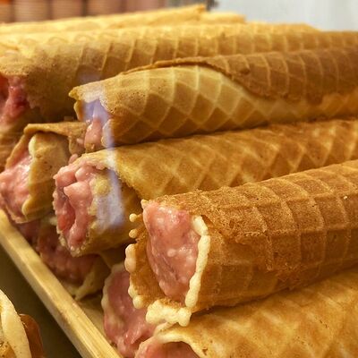 Начинка: творожный сыр, земляничное варенье. Трубочка: масло сливочное, мука, сахар, яйца