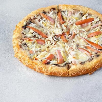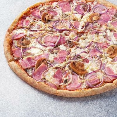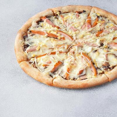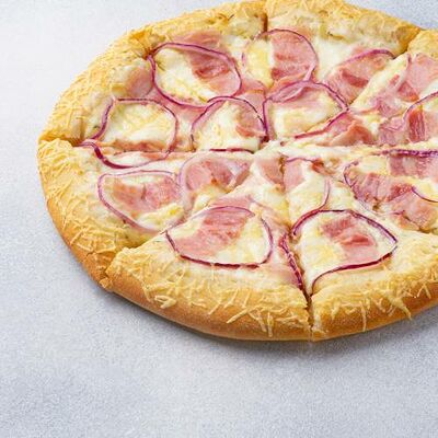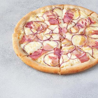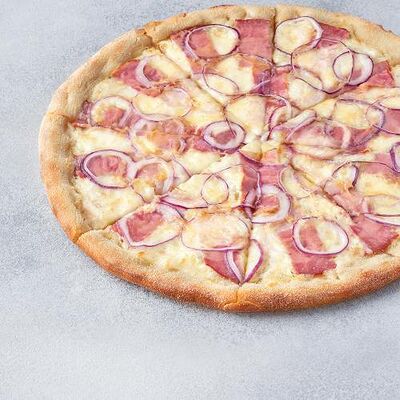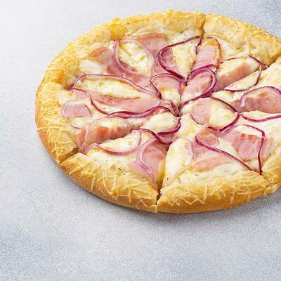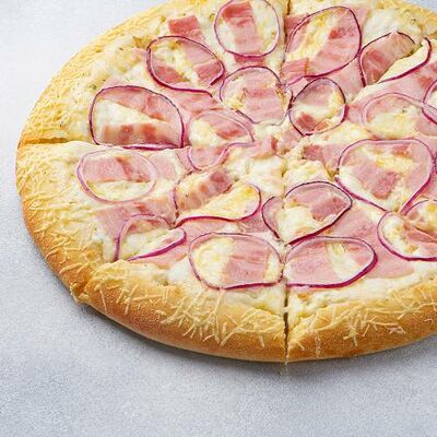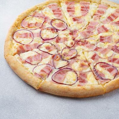 Охотничьи колбаски, ветчина, бекон, моцарелла, пармезан, красный лук, сливочно-чесночный соус, барбекю соус (40 см)