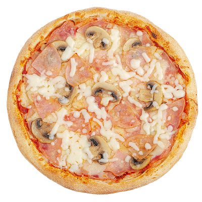 ветчина, бекон, моцарелла, шампиньоны, пармезан, лук красный, лук репчатый, пицца-соус