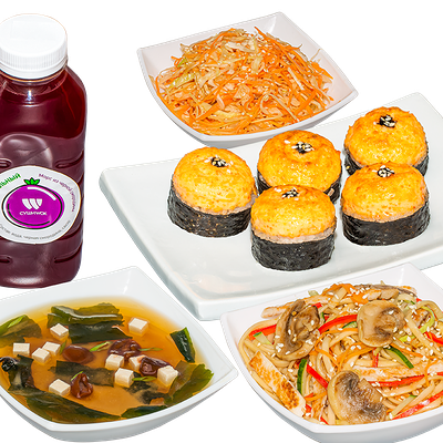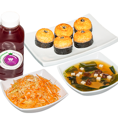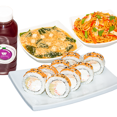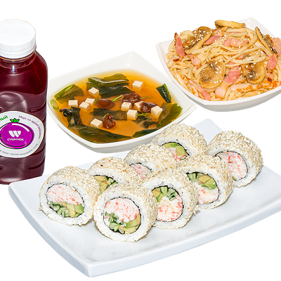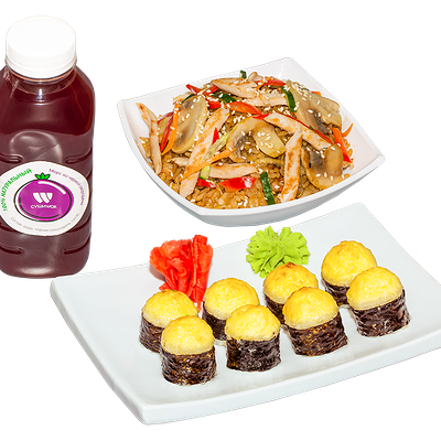 лосось, краб-крем, омлет тамаго, огурец, масаго, сырный соус, медовый соус с горчицей, шеф-соус, кунжут