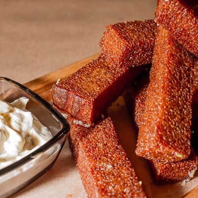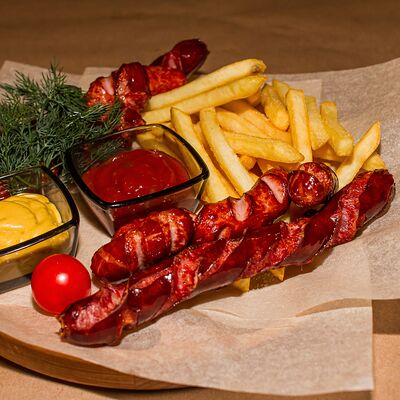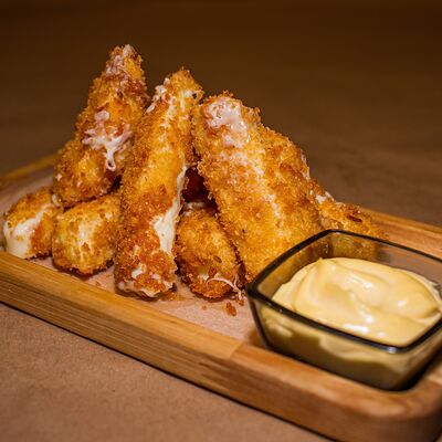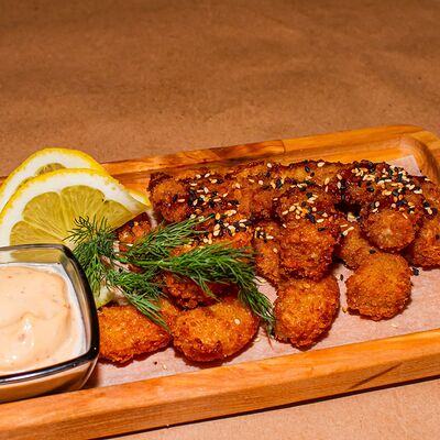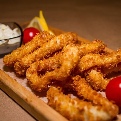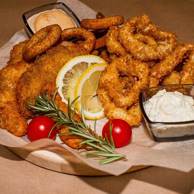 Кольца кальмара в кляре, луковые кольца в кляре, треска, соус
