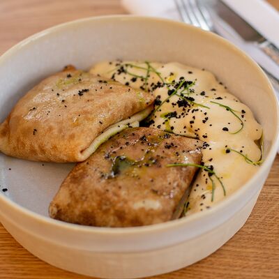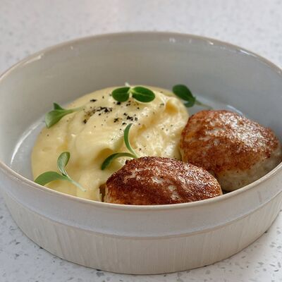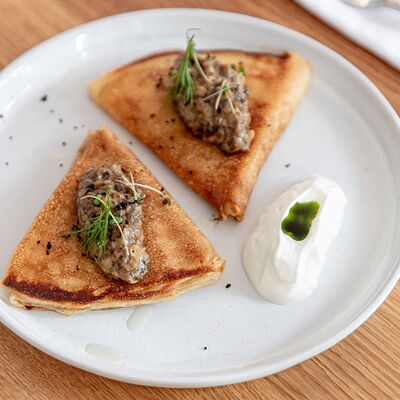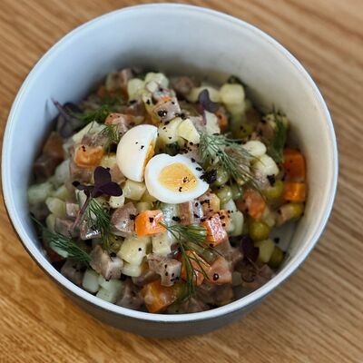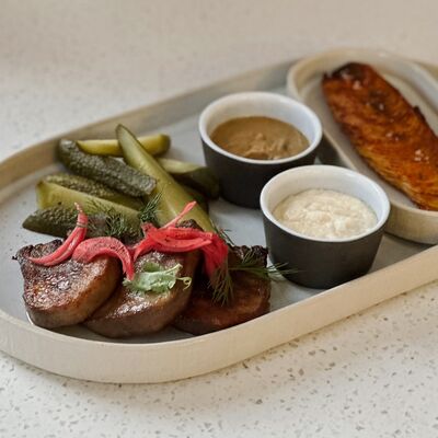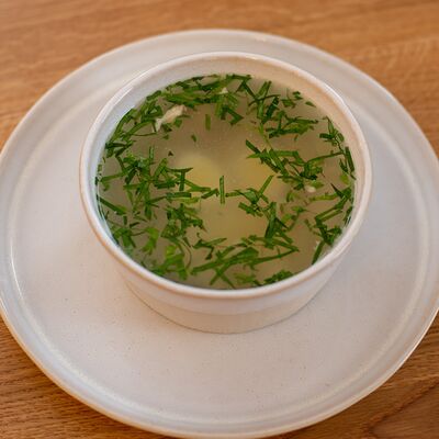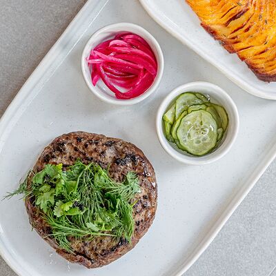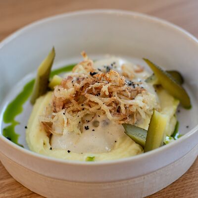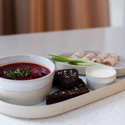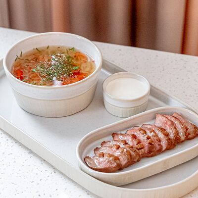 Говядина, масло растительное, сметана, куриный бульон, сливки, картофель, лук, молоко, сливки, масло зеленое, зелень, огурец маринованный