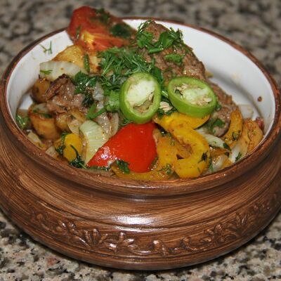 Свиная вырезка, картофель, перец болгарский, помидоры, чеснок, зелень, специи