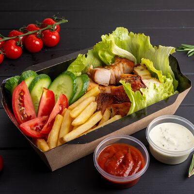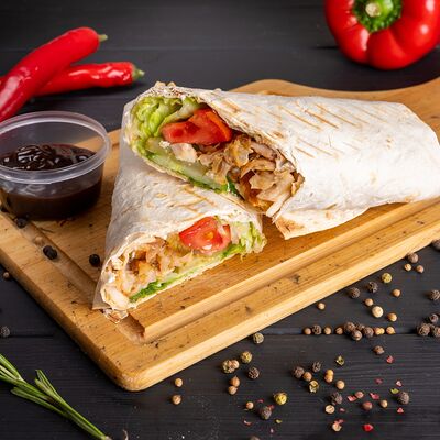 Лаваш тандырный, жареная курочка, свежая капустка, спелые помидоры, свежий огурчик, соус чесночный, соус томатный