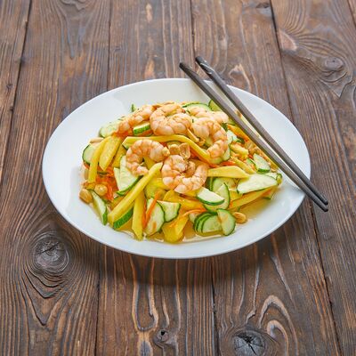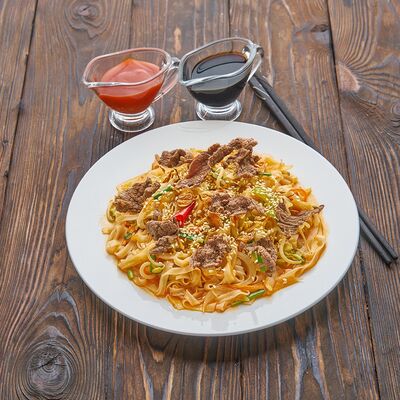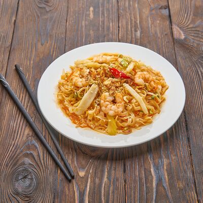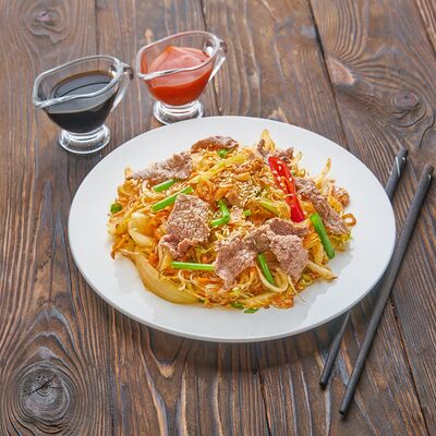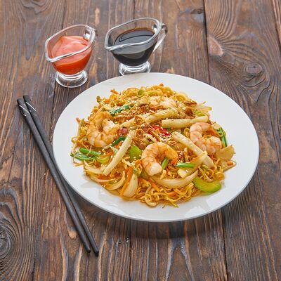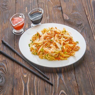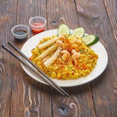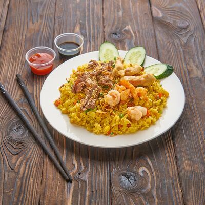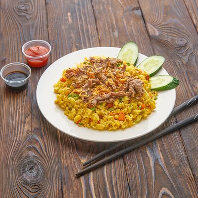 Жареный рис, креветки, говядина, курица, кукуруза, морковь, зелень