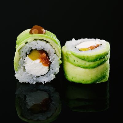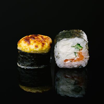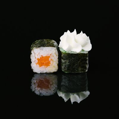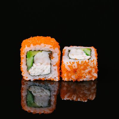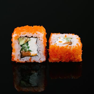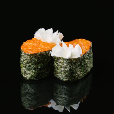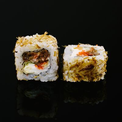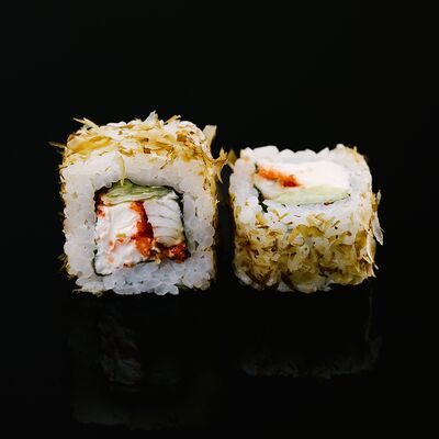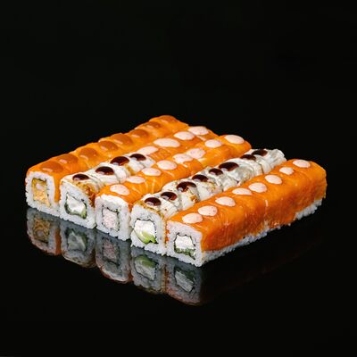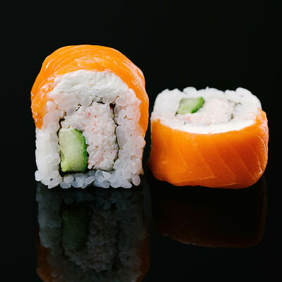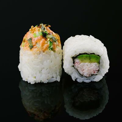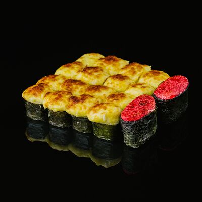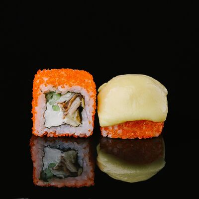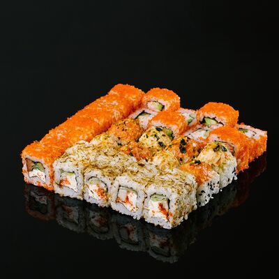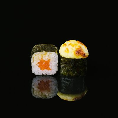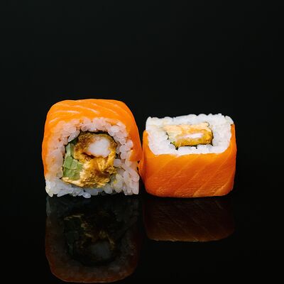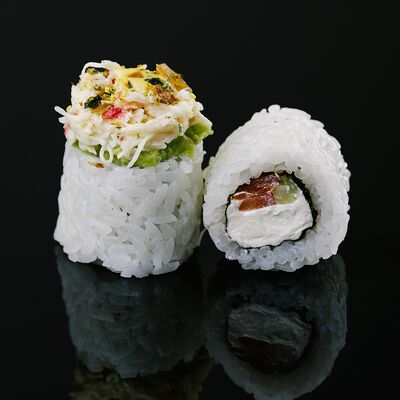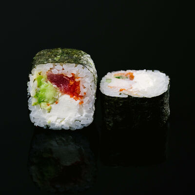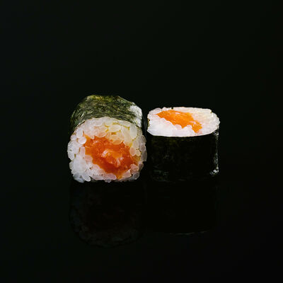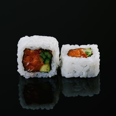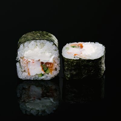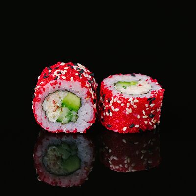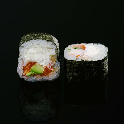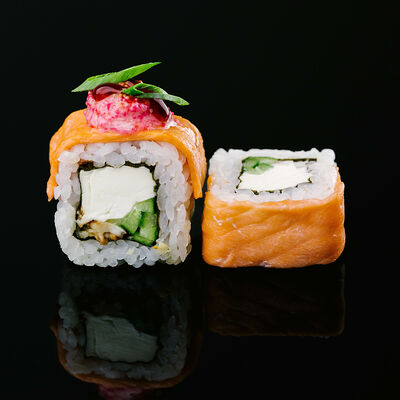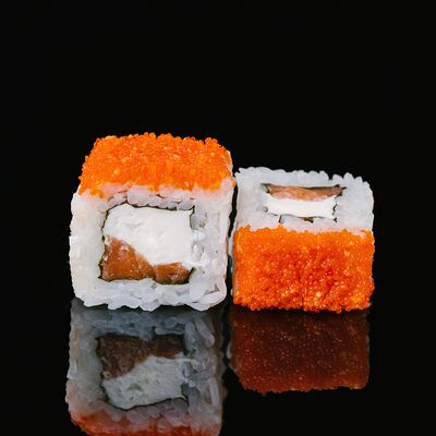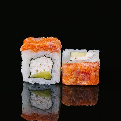 Водоросли нори, рис, сыр том ям, огурцы, икра летучей рыбы, кунжут, лосось, соус пармезан, соус спайси пикантный, соус терияки, фурикакэ (8 шт.)