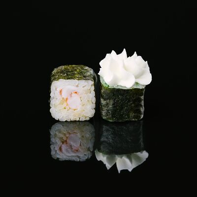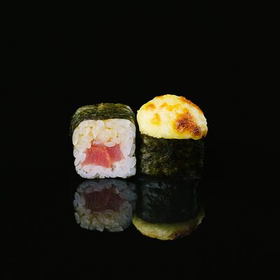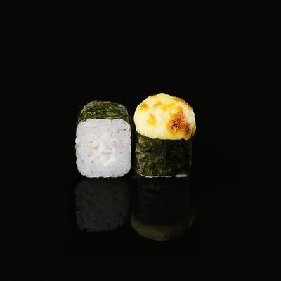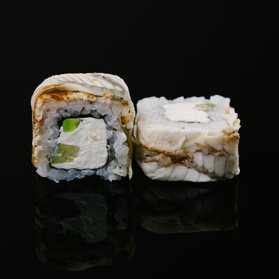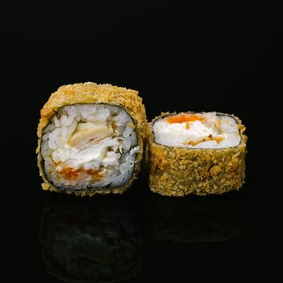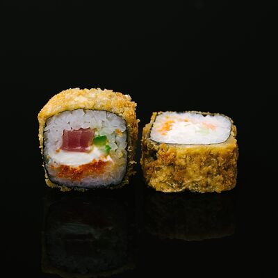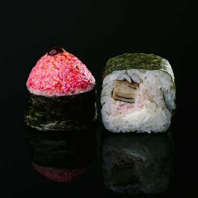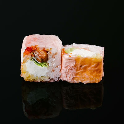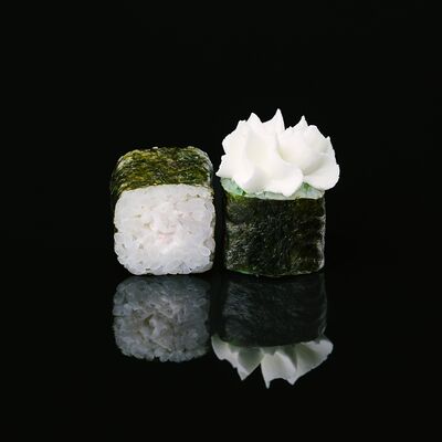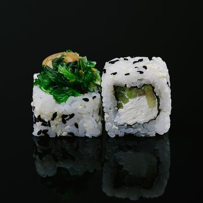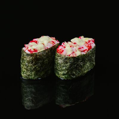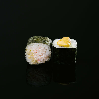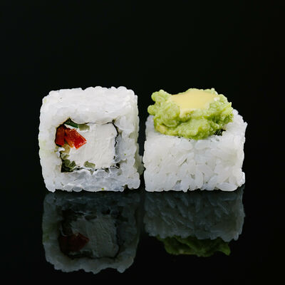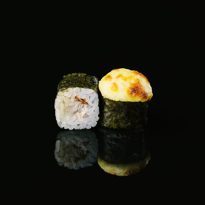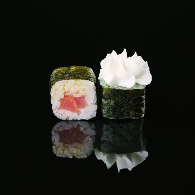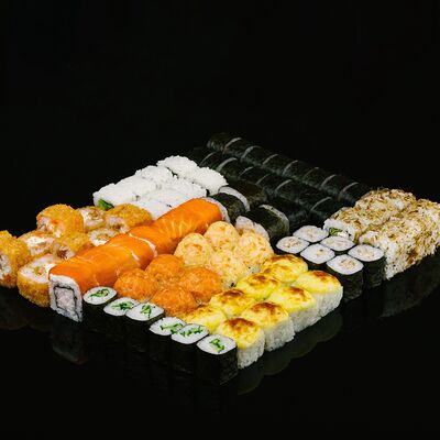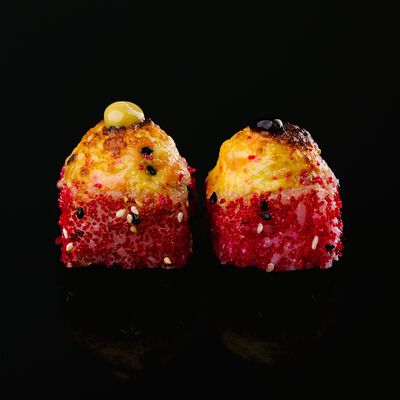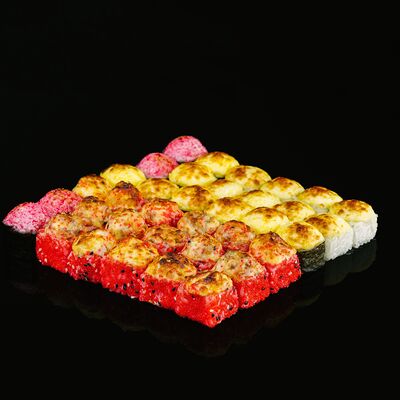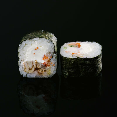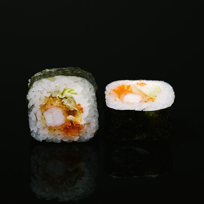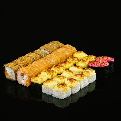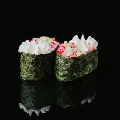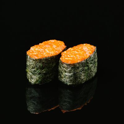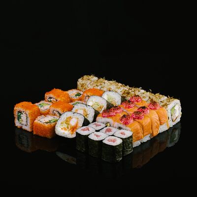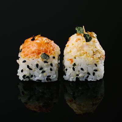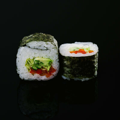 Водоросли нори, рис, сыр том ям, огурцы, икра летучей рыбы, кунжут, лосось, соус пармезан, соус спайси пикантный, соус терияки, фурикакэ (8 шт.)