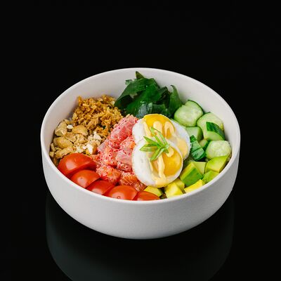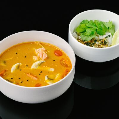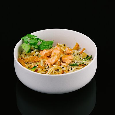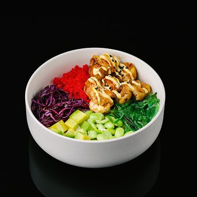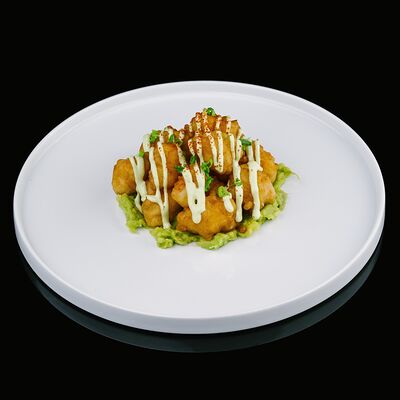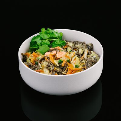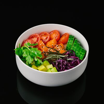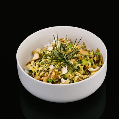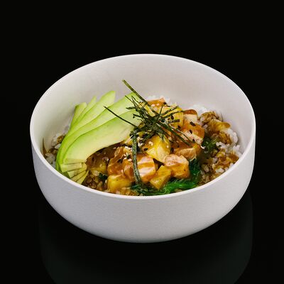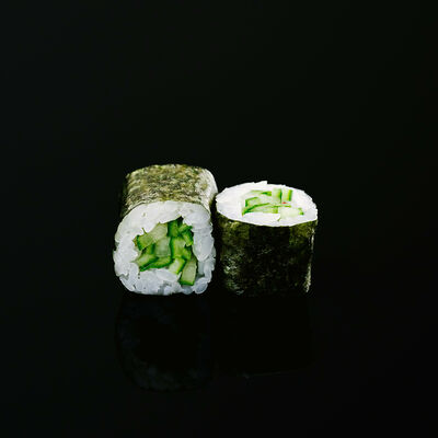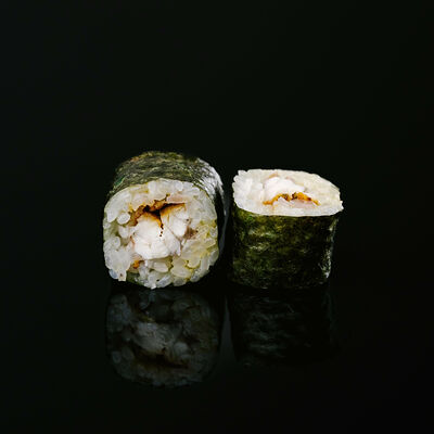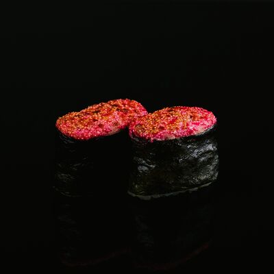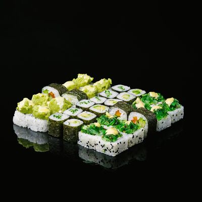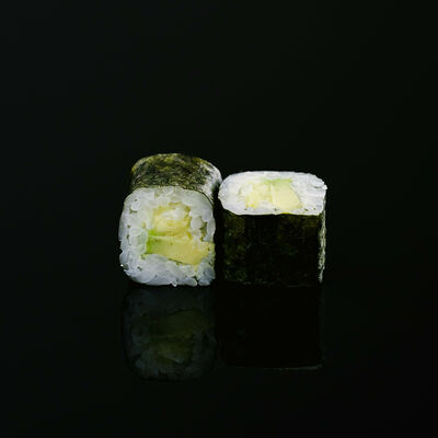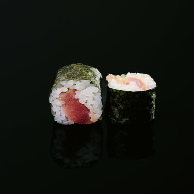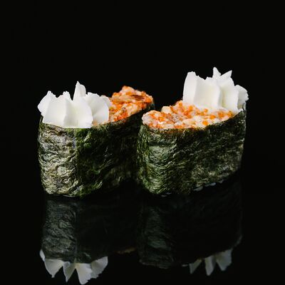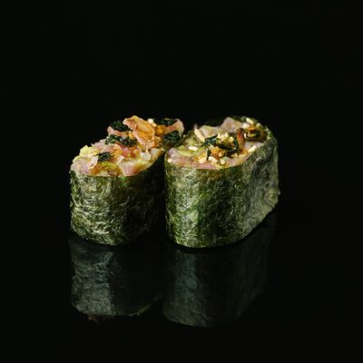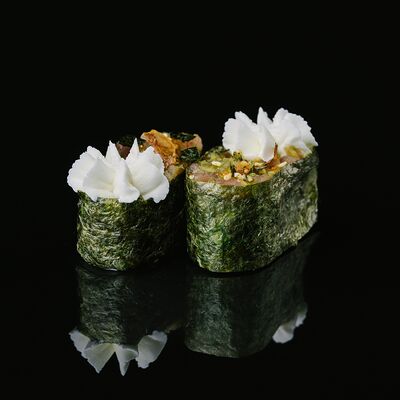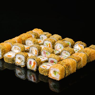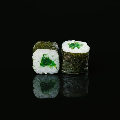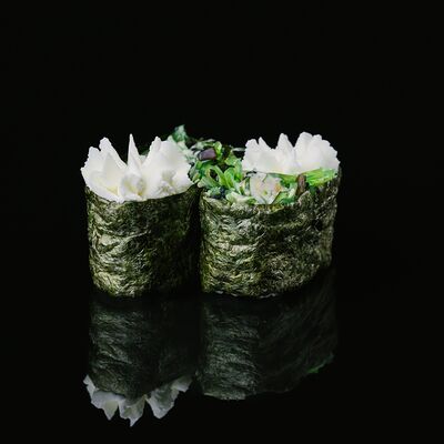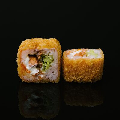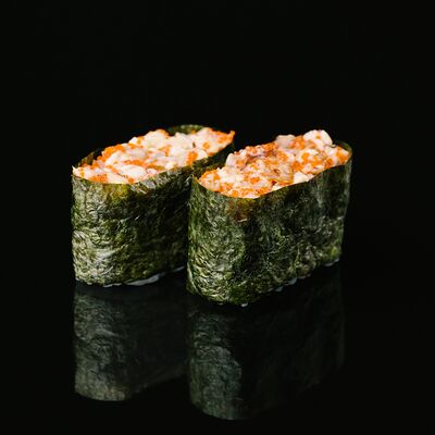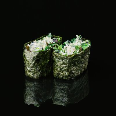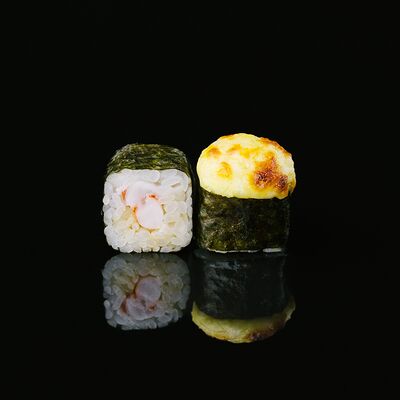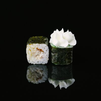 Водоросли нори, рис, сыр том ям, огурцы, икра летучей рыбы, кунжут, лосось, соус пармезан, соус спайси пикантный, соус терияки, фурикакэ (8 шт.)