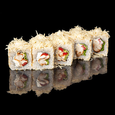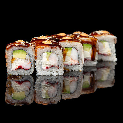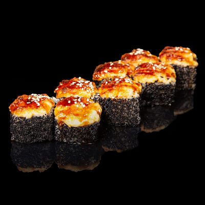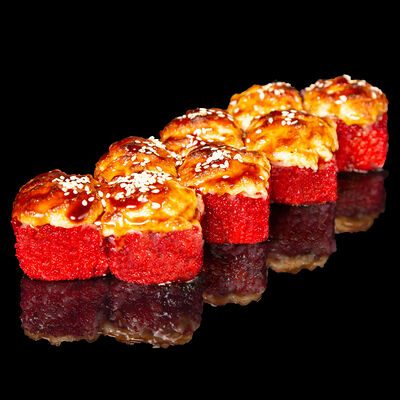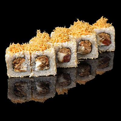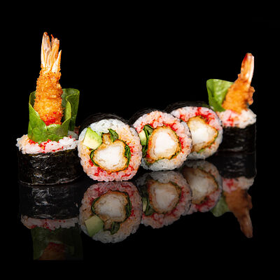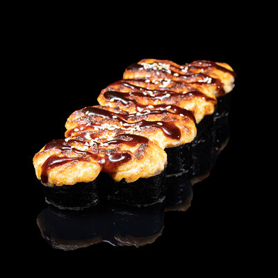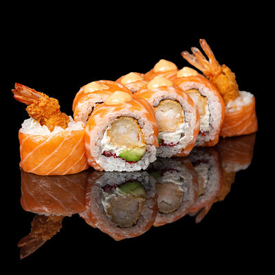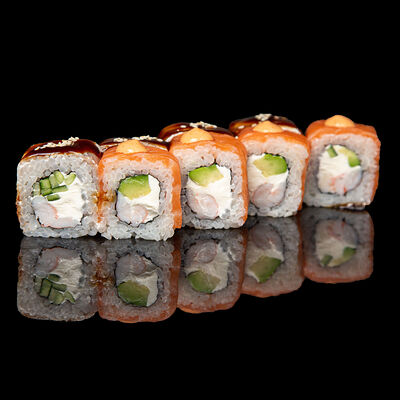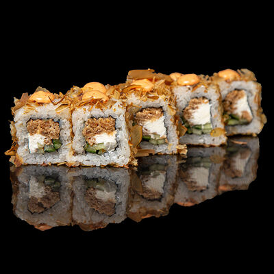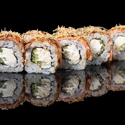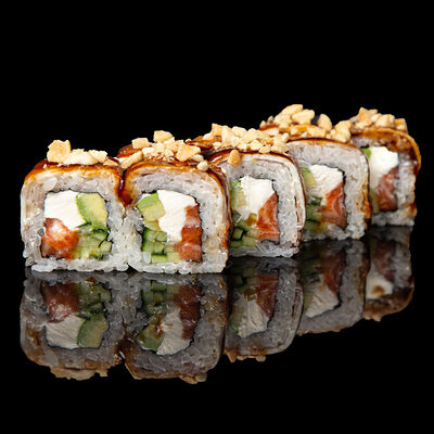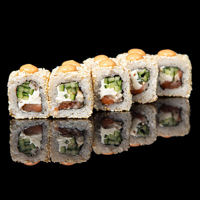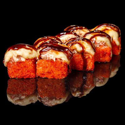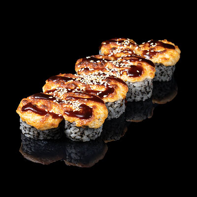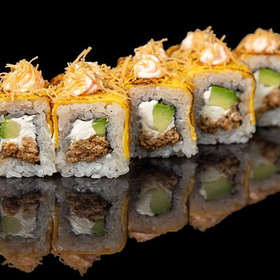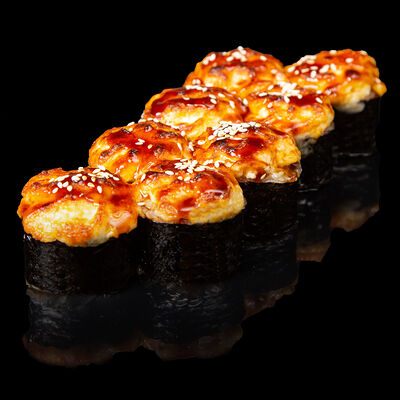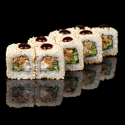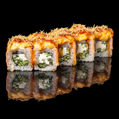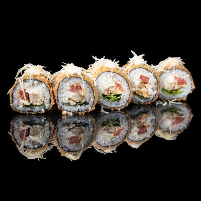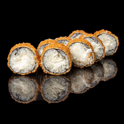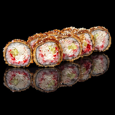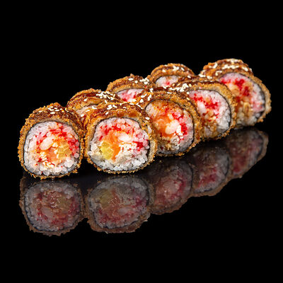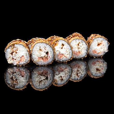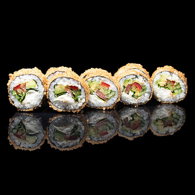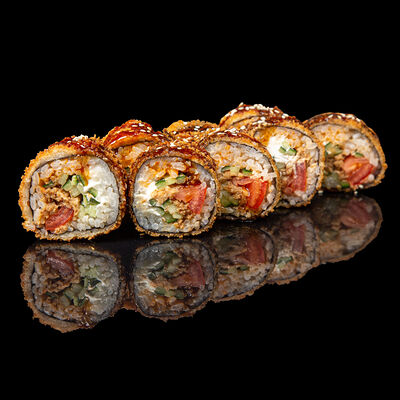 Нори, рис, сыр креметте, жаренный лосось, огурец, помидоры, соус спайс, кляр, сухари панко, соус терияки, кунжут