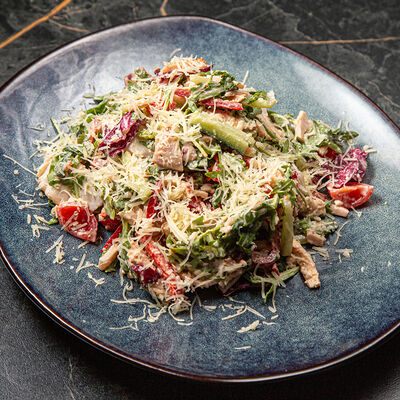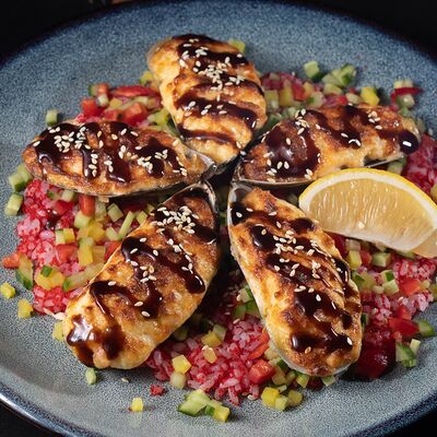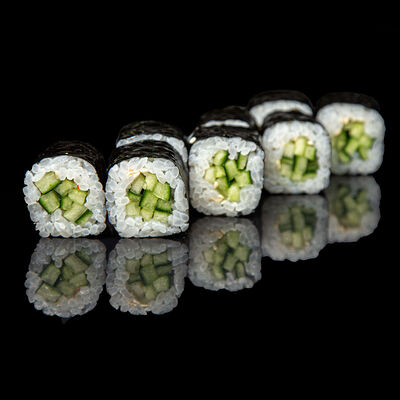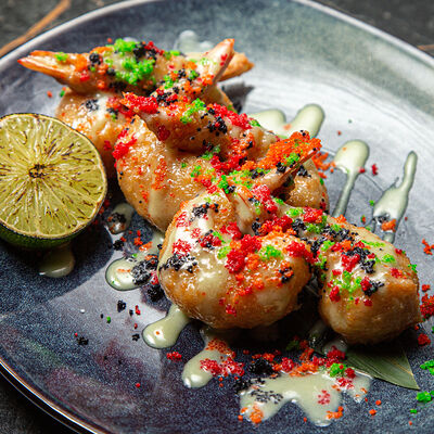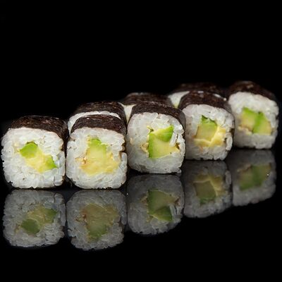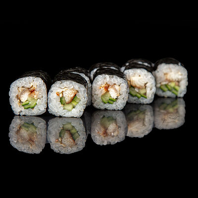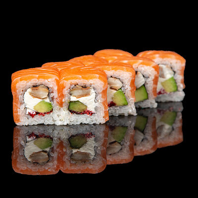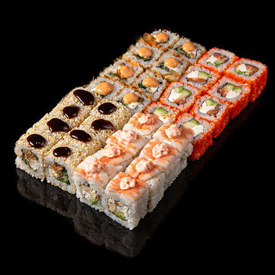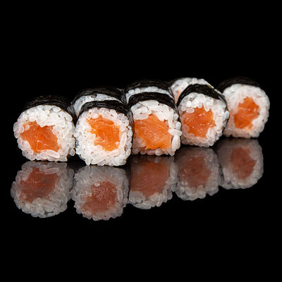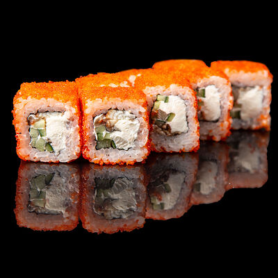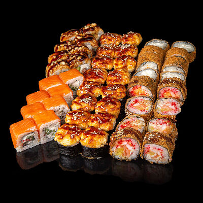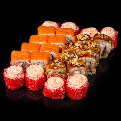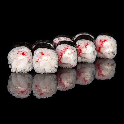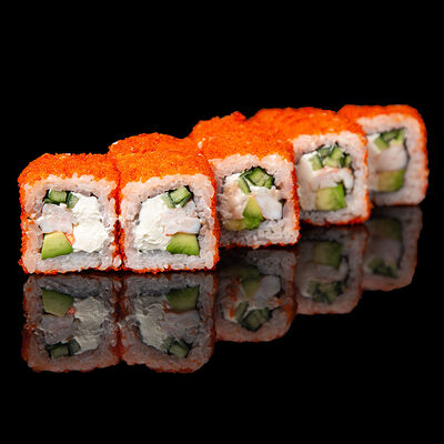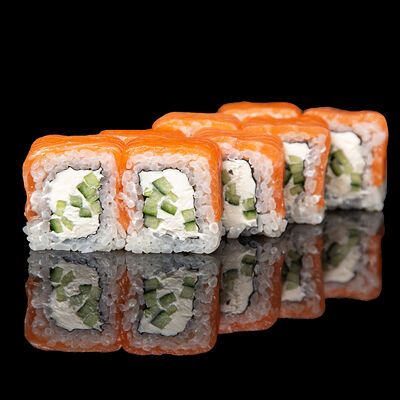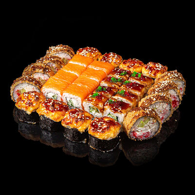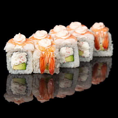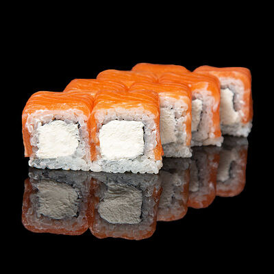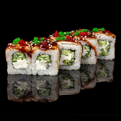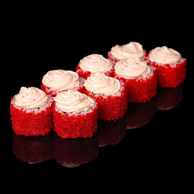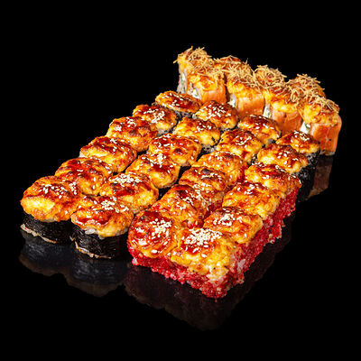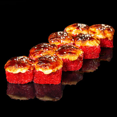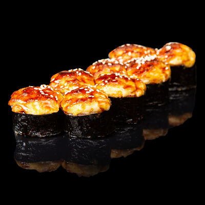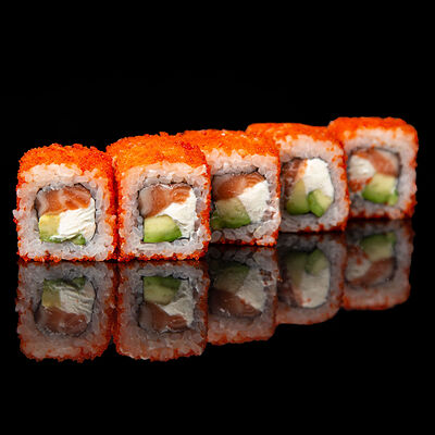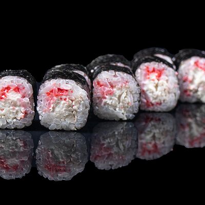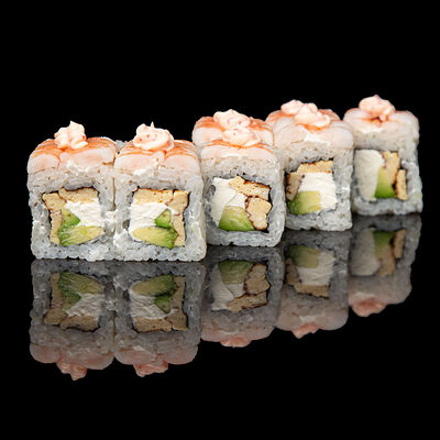 Нори, рис, сыр креметте, жаренный лосось, огурец, помидоры, соус спайс, кляр, сухари панко, соус терияки, кунжут