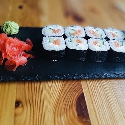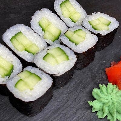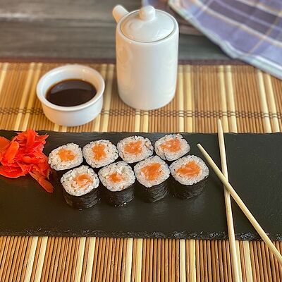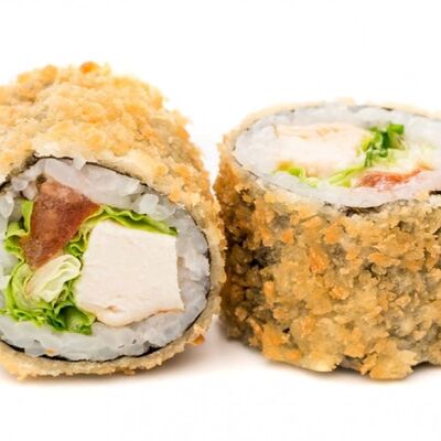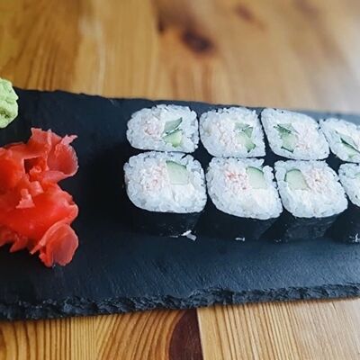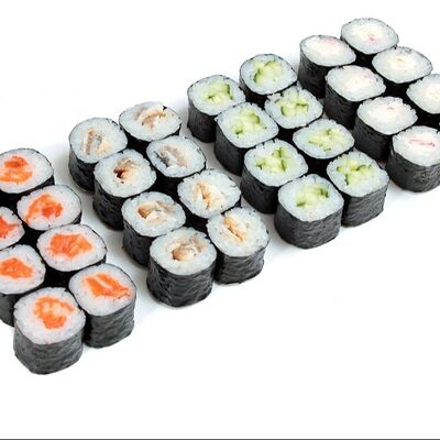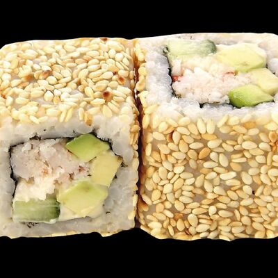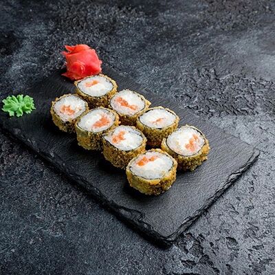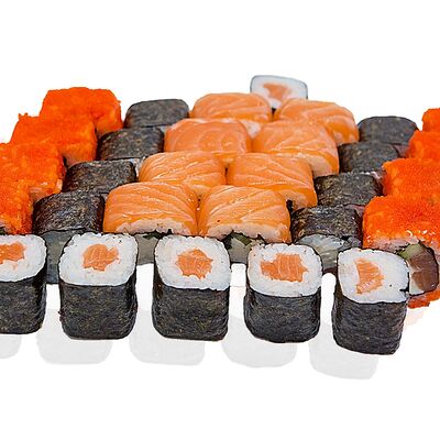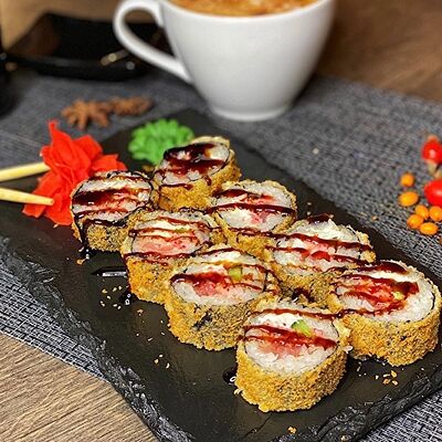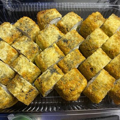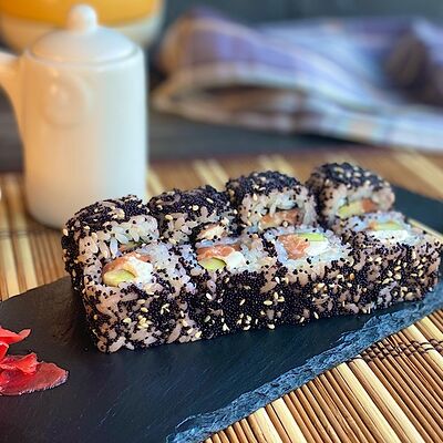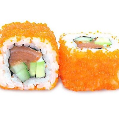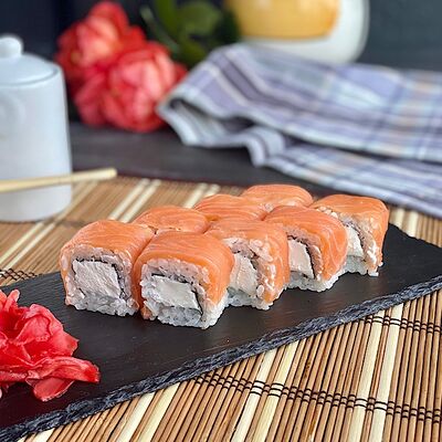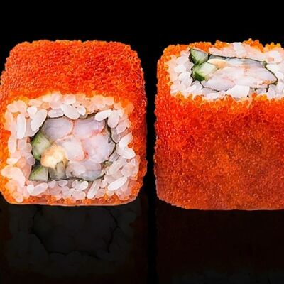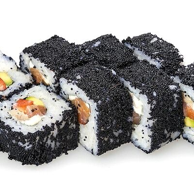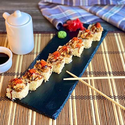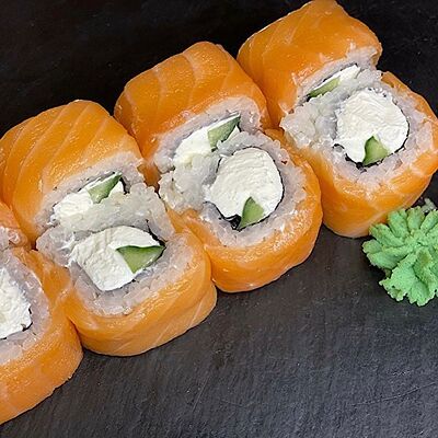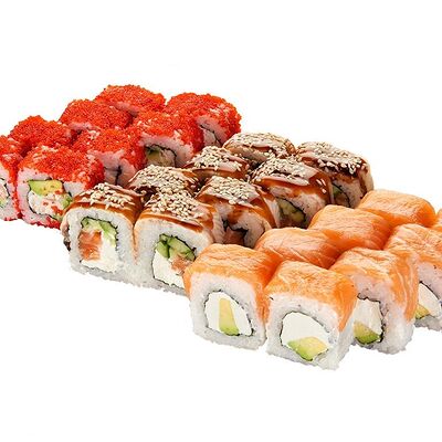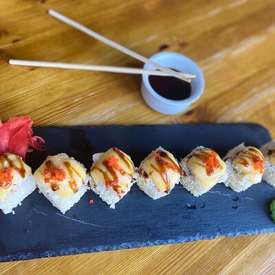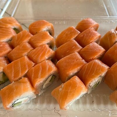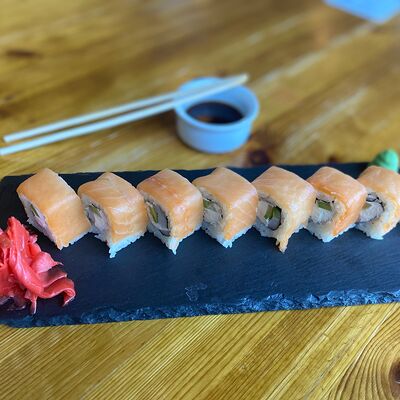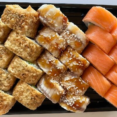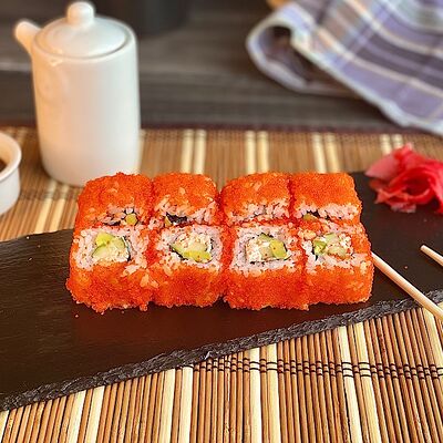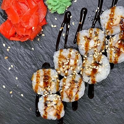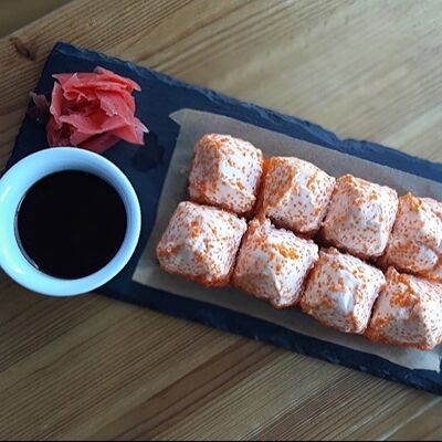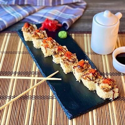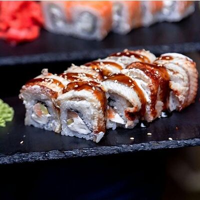 Рис, угорь копченый, сыр филадельфия, лосось, огурец, спайси соус, масаго, нори. 8 шт