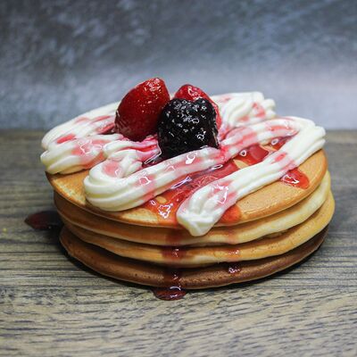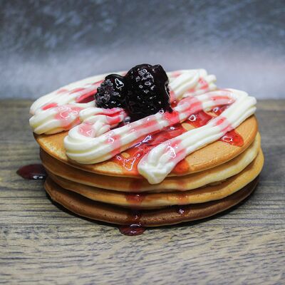 Панкейки (мука в/с, молоко, яйца, сахар, соль), крем-чиз, ежевика, топпинг лесные ягоды