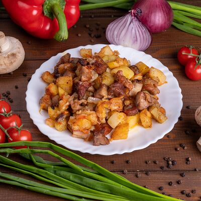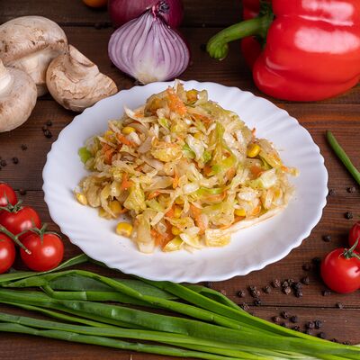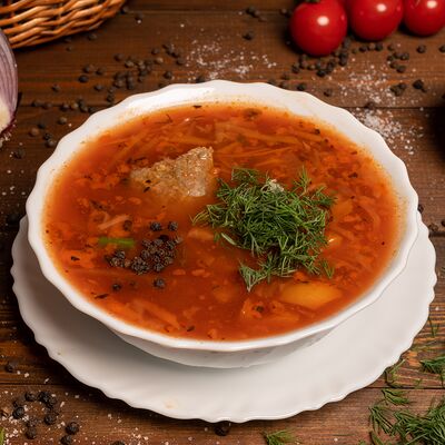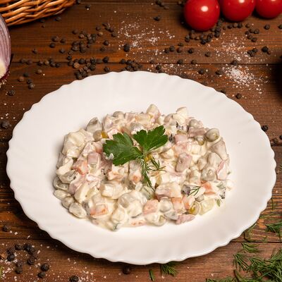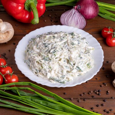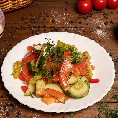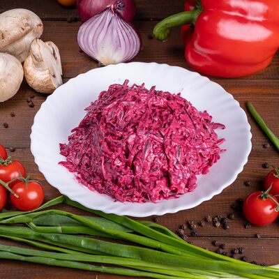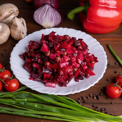 Картофель, морковь, свекла, соленые огурцы, репчатый лук, уксус, растительное масло, сахар, зелень петрушки и укропа, соль, черный перец, специи