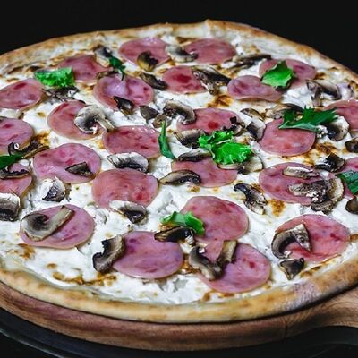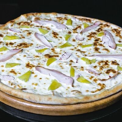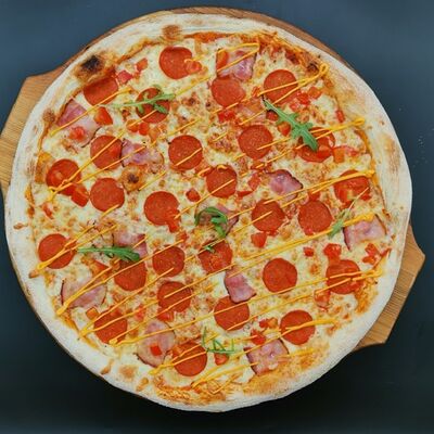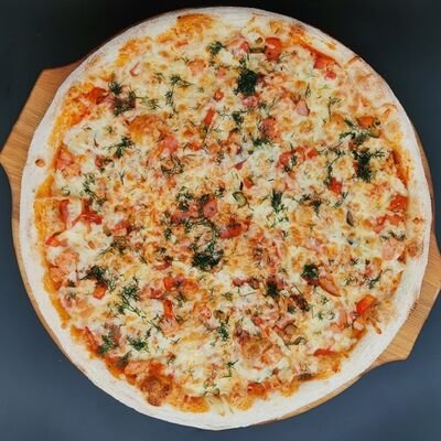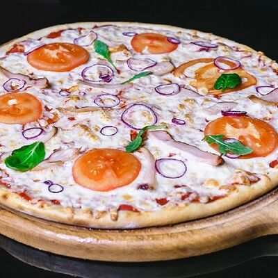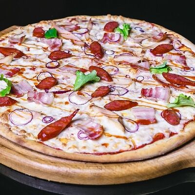 Соус томатный, сыр моцарелла, курица копченая, бекон, охотничьи колбаски, лук красный, соус барбекю