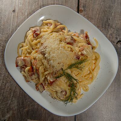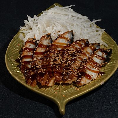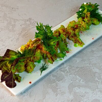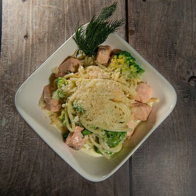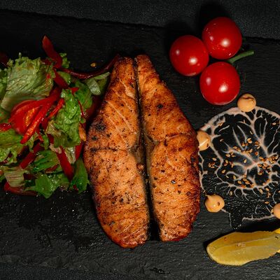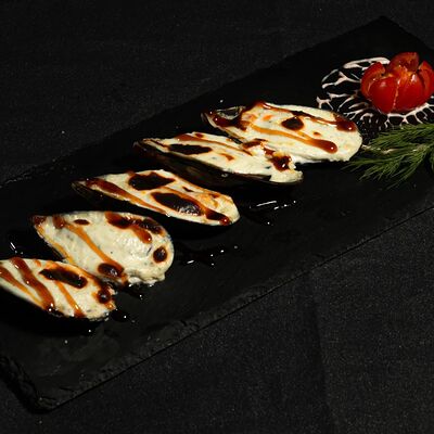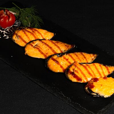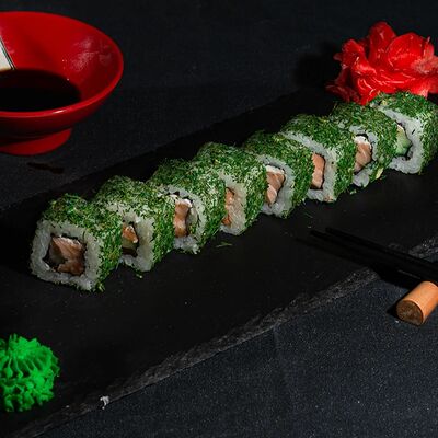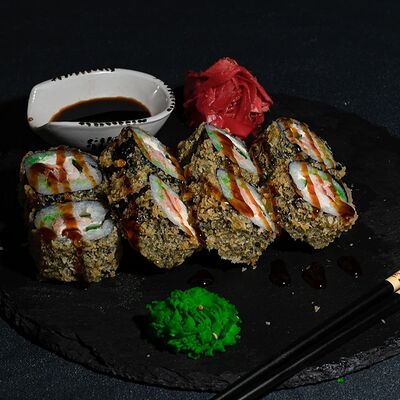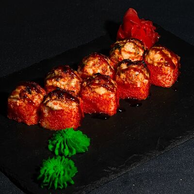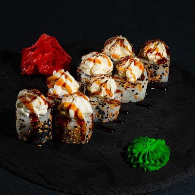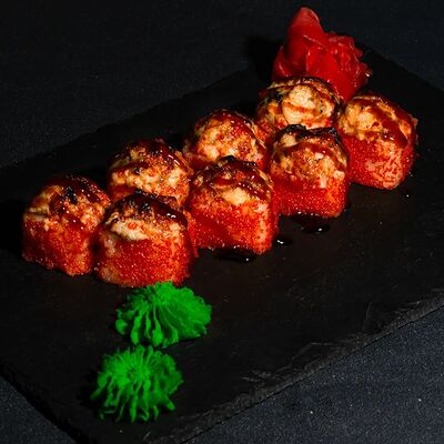 Запеченный ролл с лососем и снежным крабом - это изысканное блюдо, состоящее из свежего лосося и снежного краба, завернутых в нори и рис, приправленных спайси соусом и обсыпанных кунжутом. Авокадо и сыр кремете добавляют мягкость, а сыр пармезан - изысканность. А вкус ролла подчеркивают унаги соус, соевый соус, имбирь и васаби
