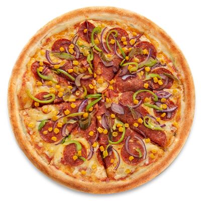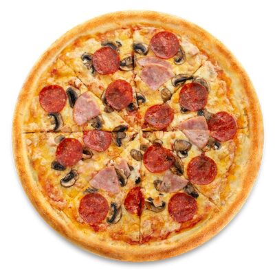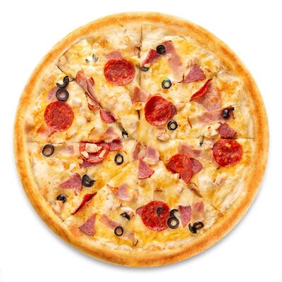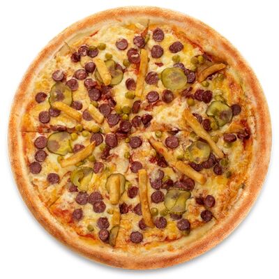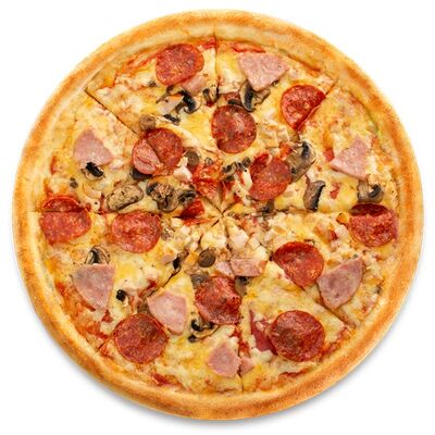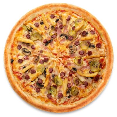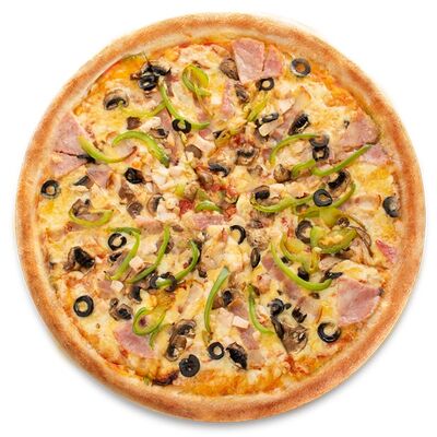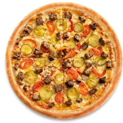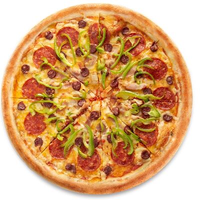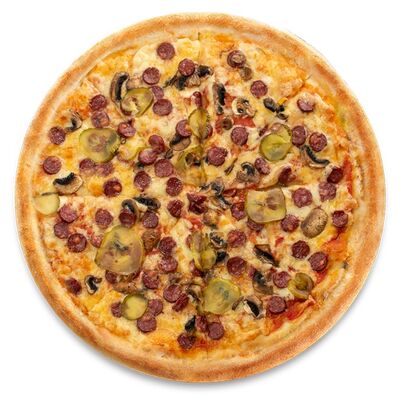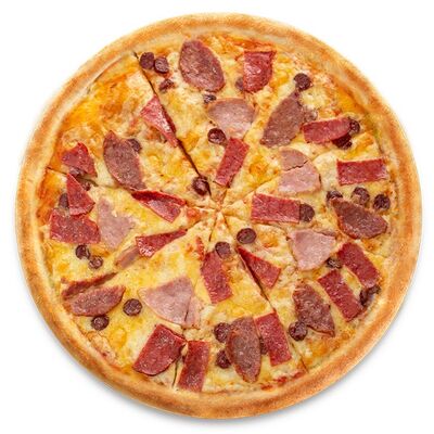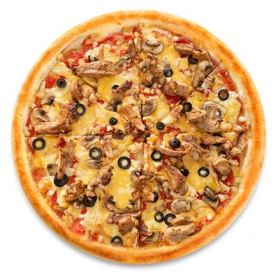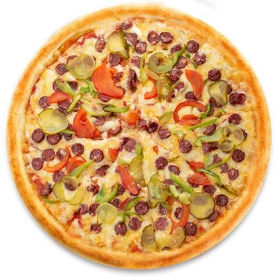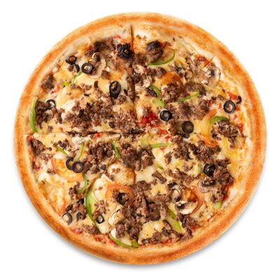 Говядина, перец болгарский, помидоры, грибы, маслины, сыр моцарелла, сыр сливочный, соус пикантный, тесто для пиццы