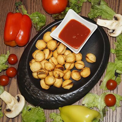 Мини пельмешки обжаренные во фритюре, подаются с соусом барбекю