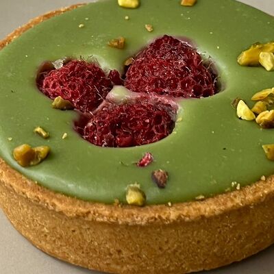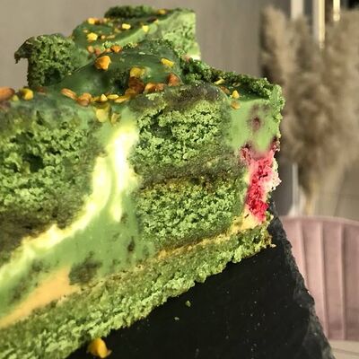 Нежное рисовое тесто, фисташковый крем, малиновый центр