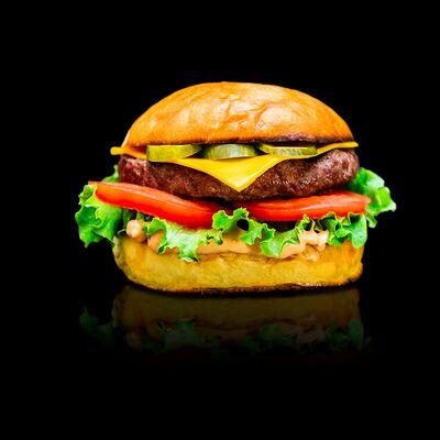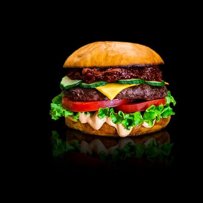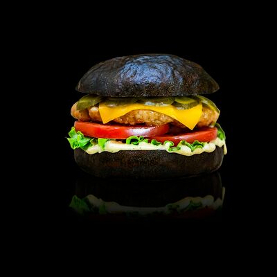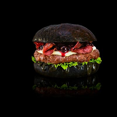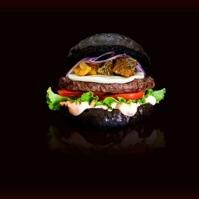 Фирменная черная булочка, котлета из мраморной говядины, сыр моцарелла, лист салата, аджапсандал, красный лук, соус барбекю