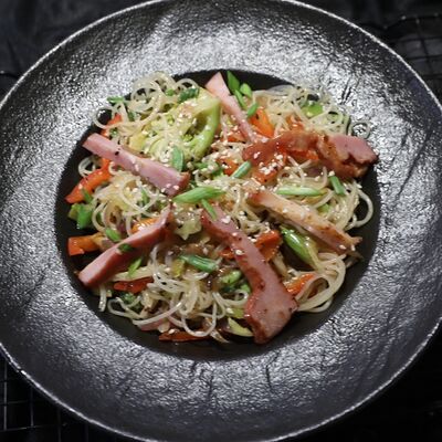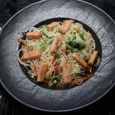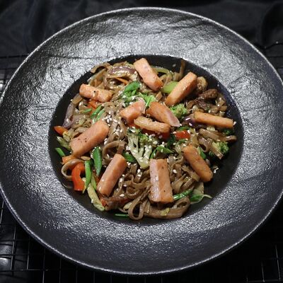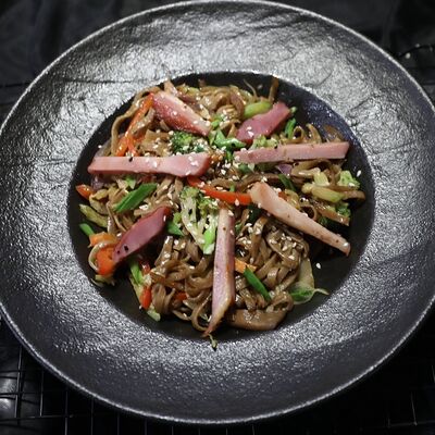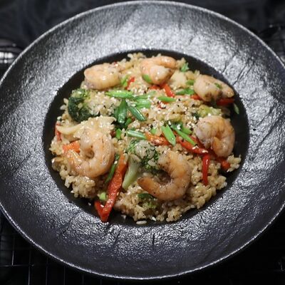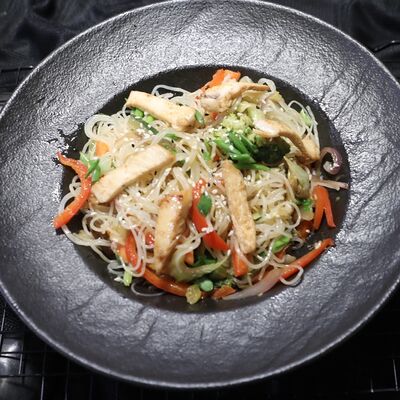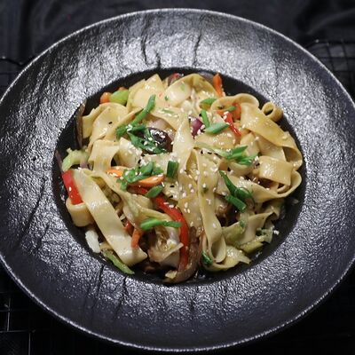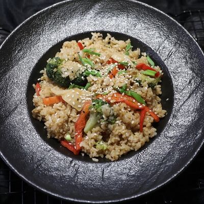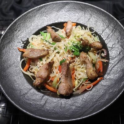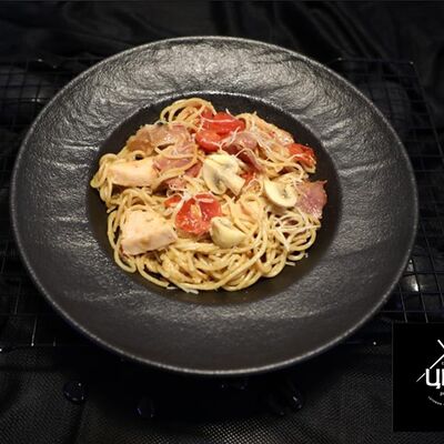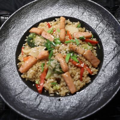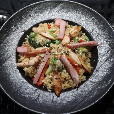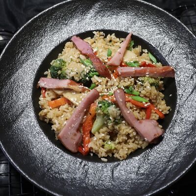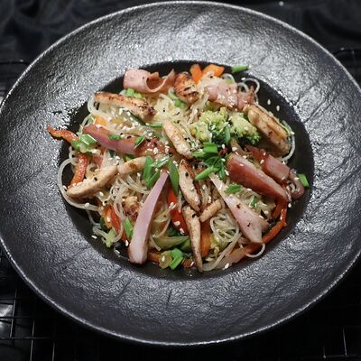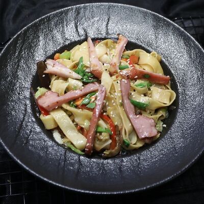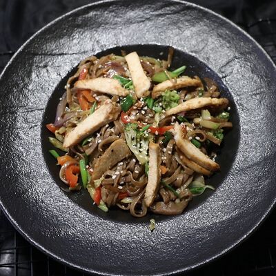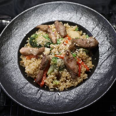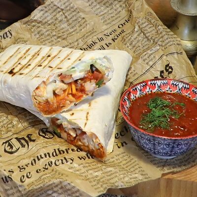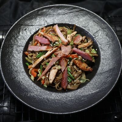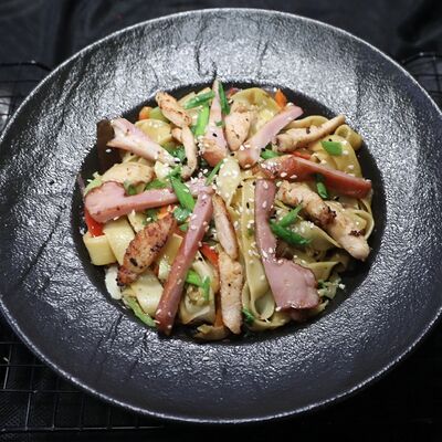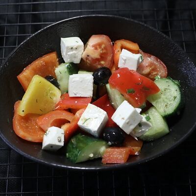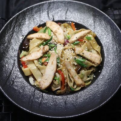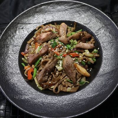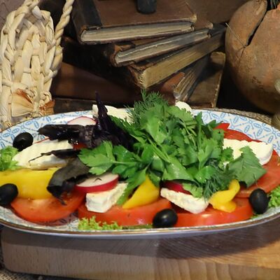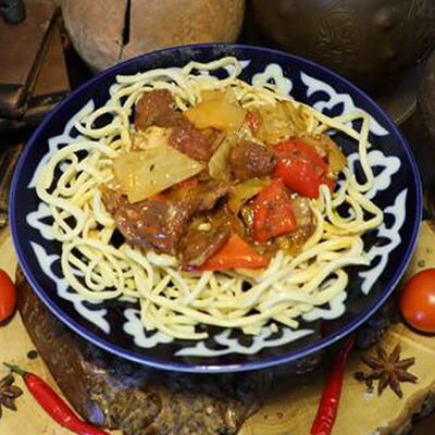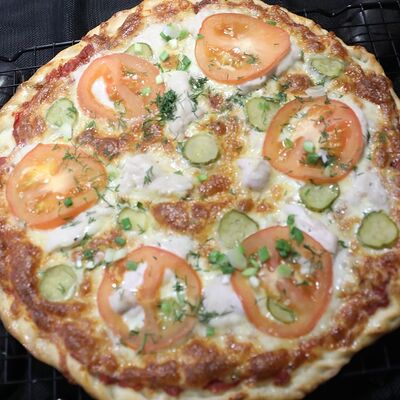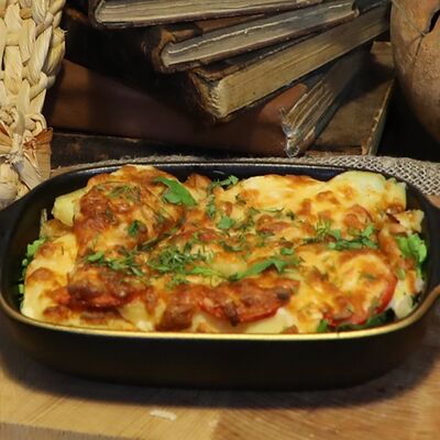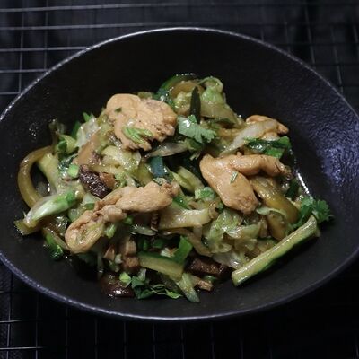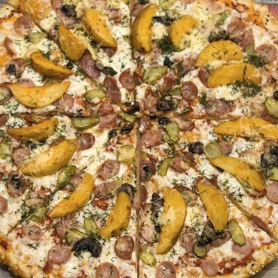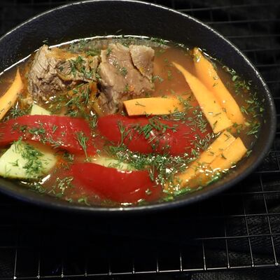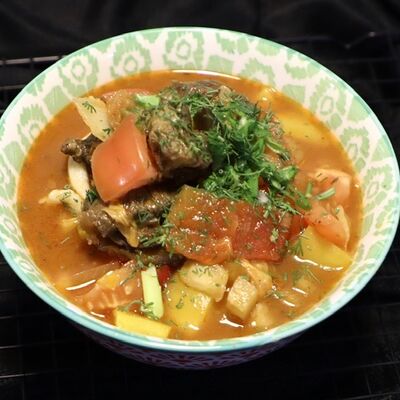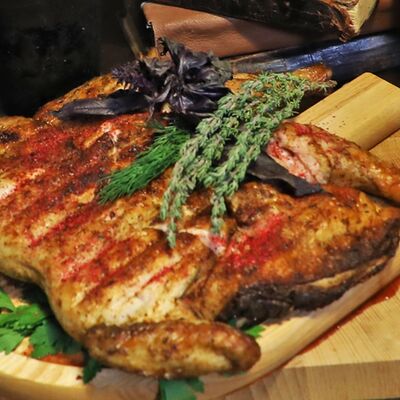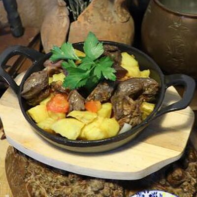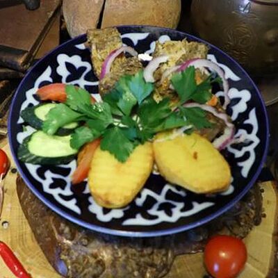 Сочные куриные кусочки (халяль) в фирменном маринаде, картофель, помидоры, кабачки, баклажаны, болгарский перец, красный лук, зелень