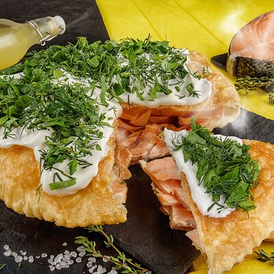 Тесто, мраморная говядина, вода, соль, перец, лук, сметана, зелень (23 см)