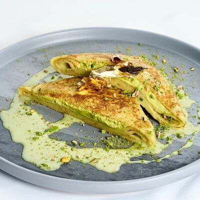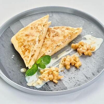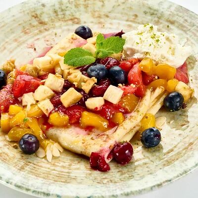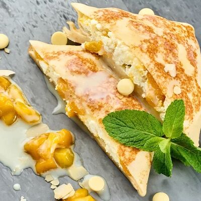 Творог, манго, белый шоколад, английский соус, лепестки миндаля, тесто