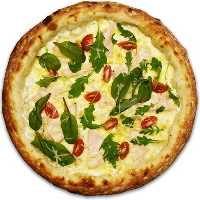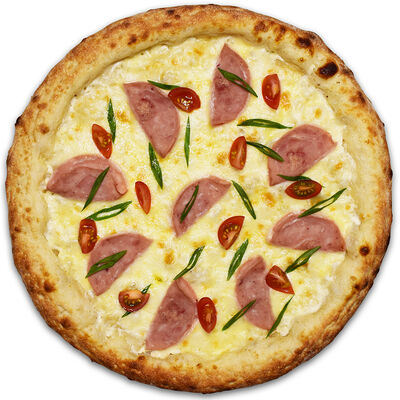 Куриная ветчина, грибы шампиньоны, моцарелла, томатный соус