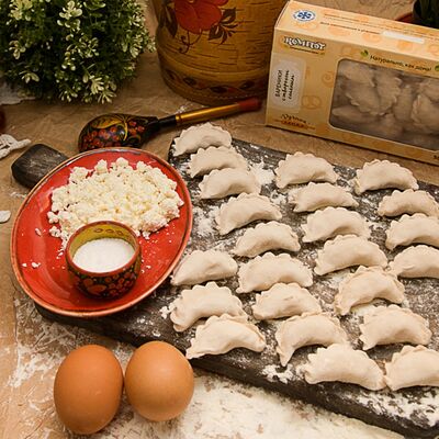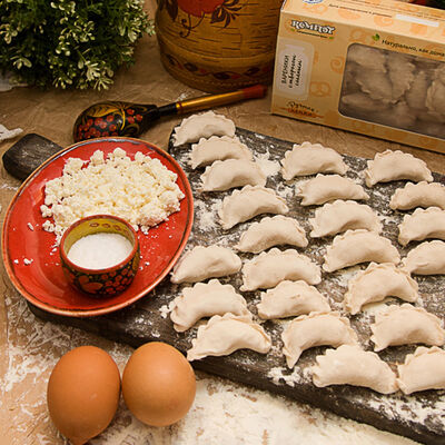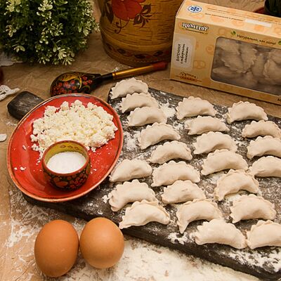 Мука высший сорт, яйцо, творог 5%, соль, сахар, ванилин, разрыхлитель, сахарная пудра