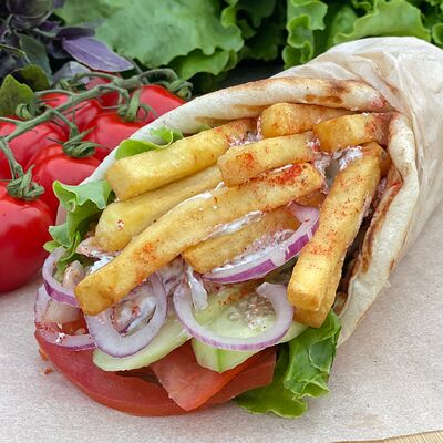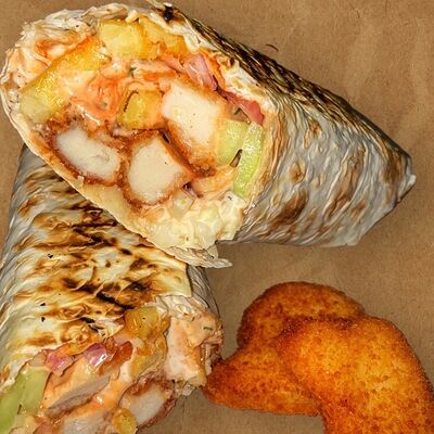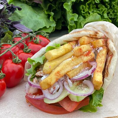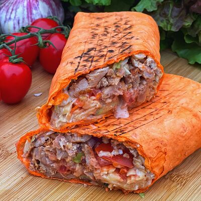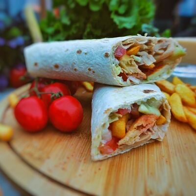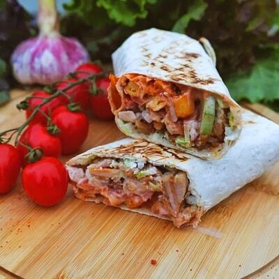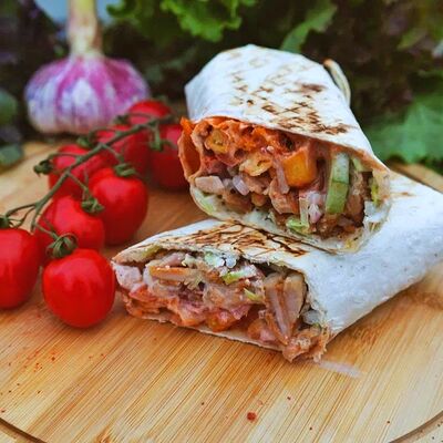 Сырный лаваш, курица гриль, капуста, красный лук, огурцы, помидоры, сыр голландский, авторские соусы