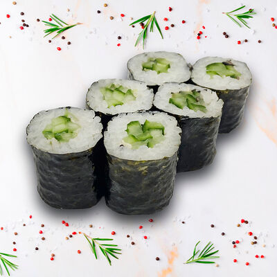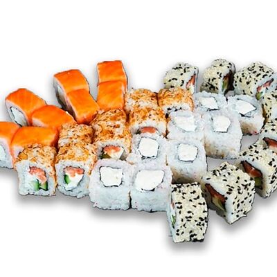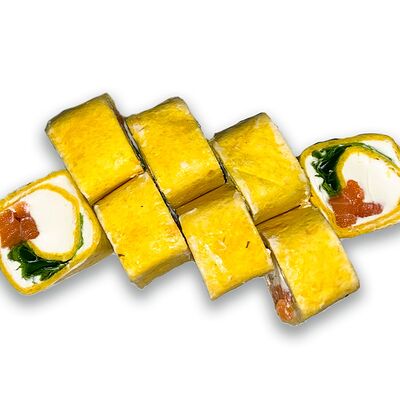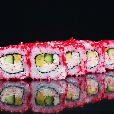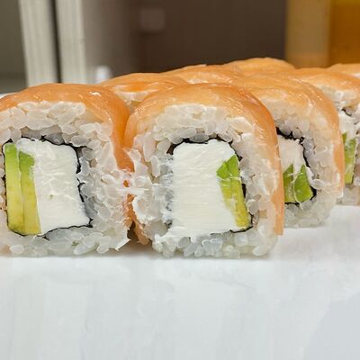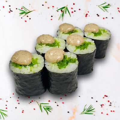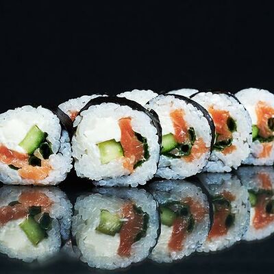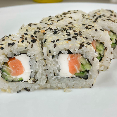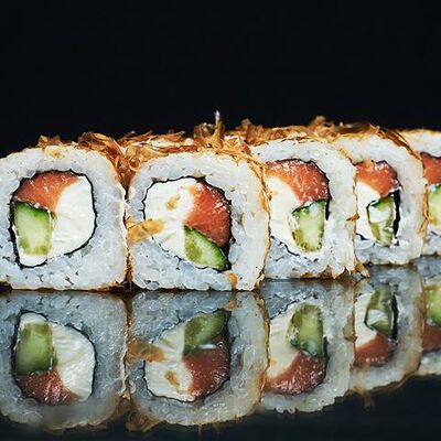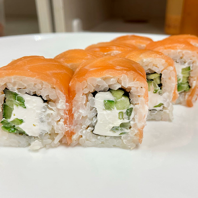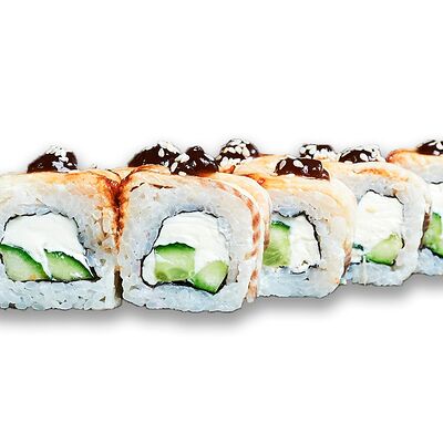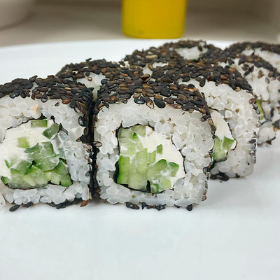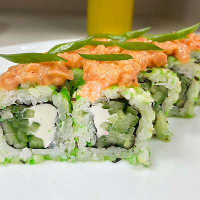 Рис, нори, сыр сливочный, огурец, масаго зеленая, кунжут черный, соус лосось, соус спайси, лук зеленый