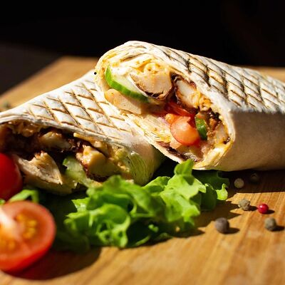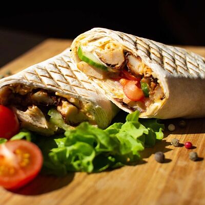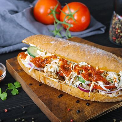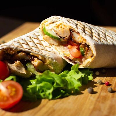 Курица, помидоры, огурцы, соус, корейская морковка, сыр, грибы